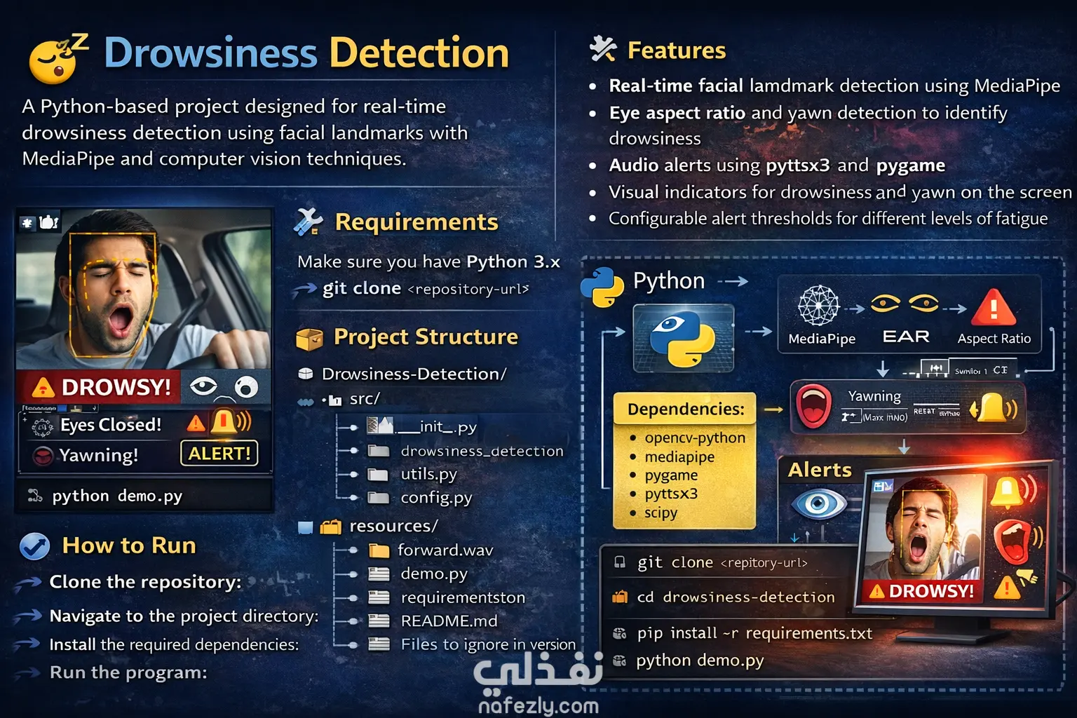 قمت بتطوير نظام ذكي لاكتشاف النعاس في الوقت الحقيقي باستخدام تقنيات الرؤية الحاسوبية (Computer Vision) ومكتبة MediaPipe لتحليل ملامح الوجه بدقة عالية.