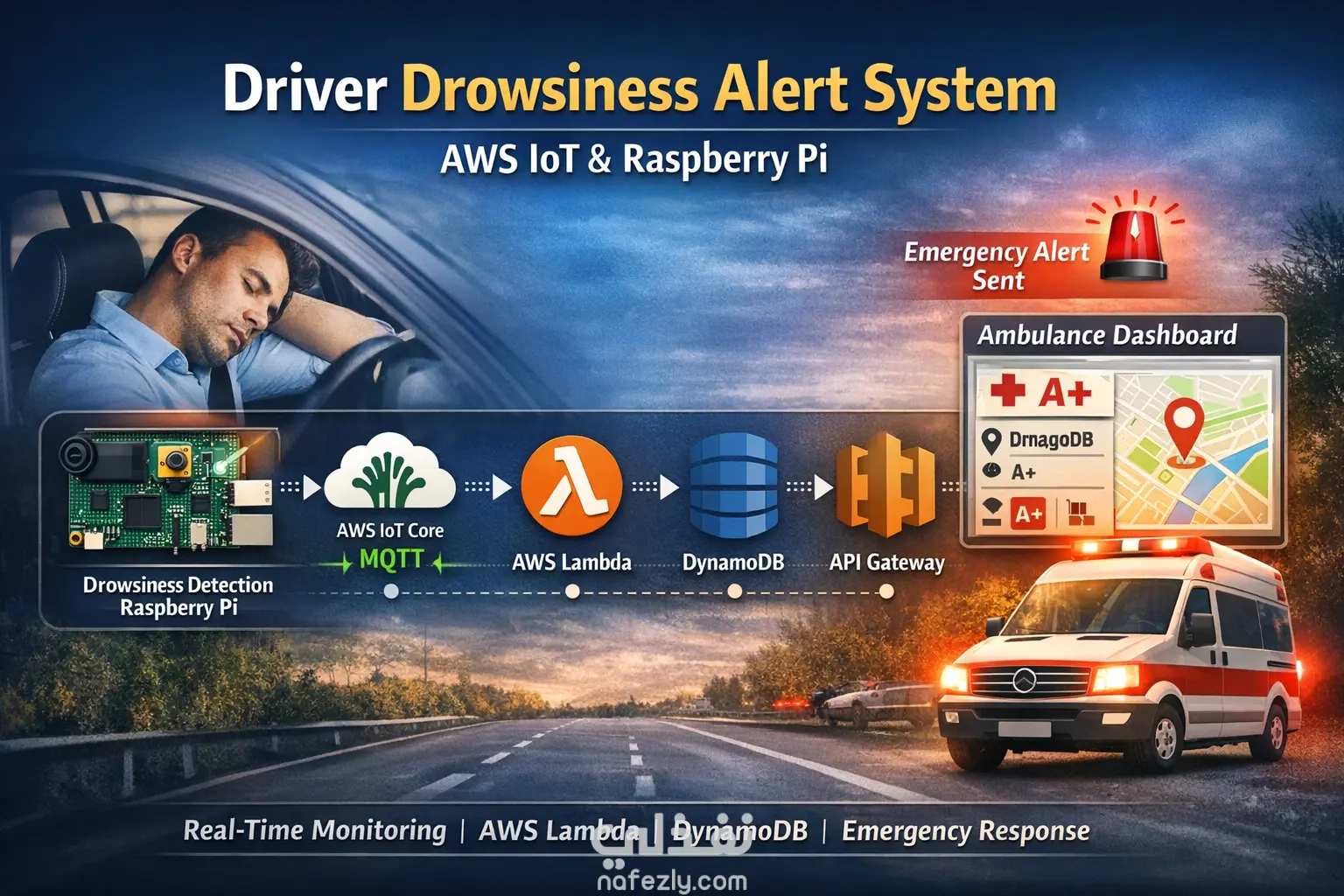 قمت بتطوير نظام متكامل لاكتشاف نعاس السائق في الوقت الحقيقي (Real-Time) مع إرسال تنبيه فوري إلى خدمات الطوارئ باستخدام AWS IoT Core وبنية سحابية متكاملة.