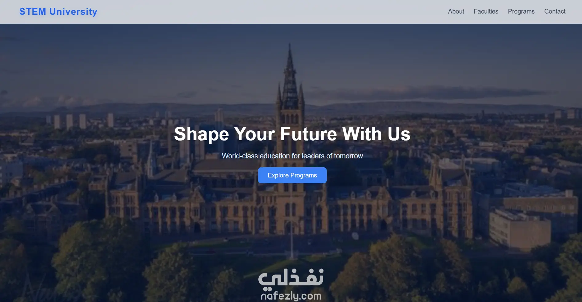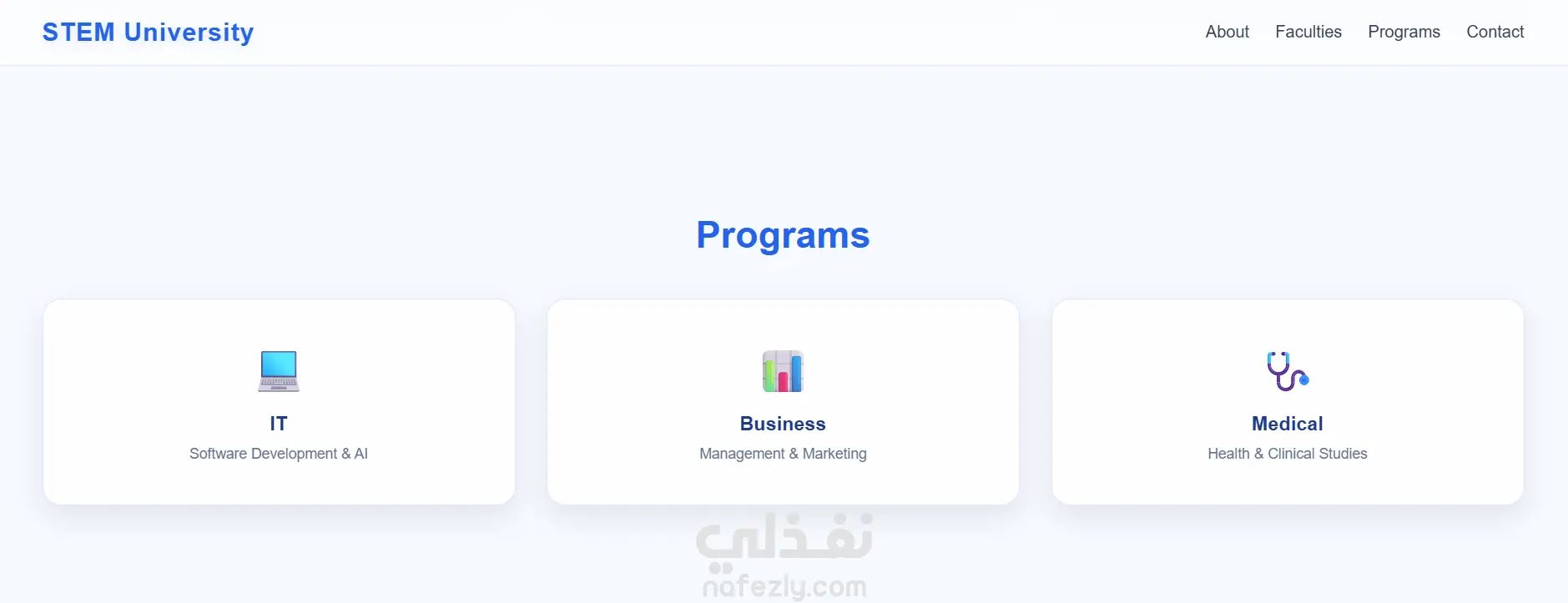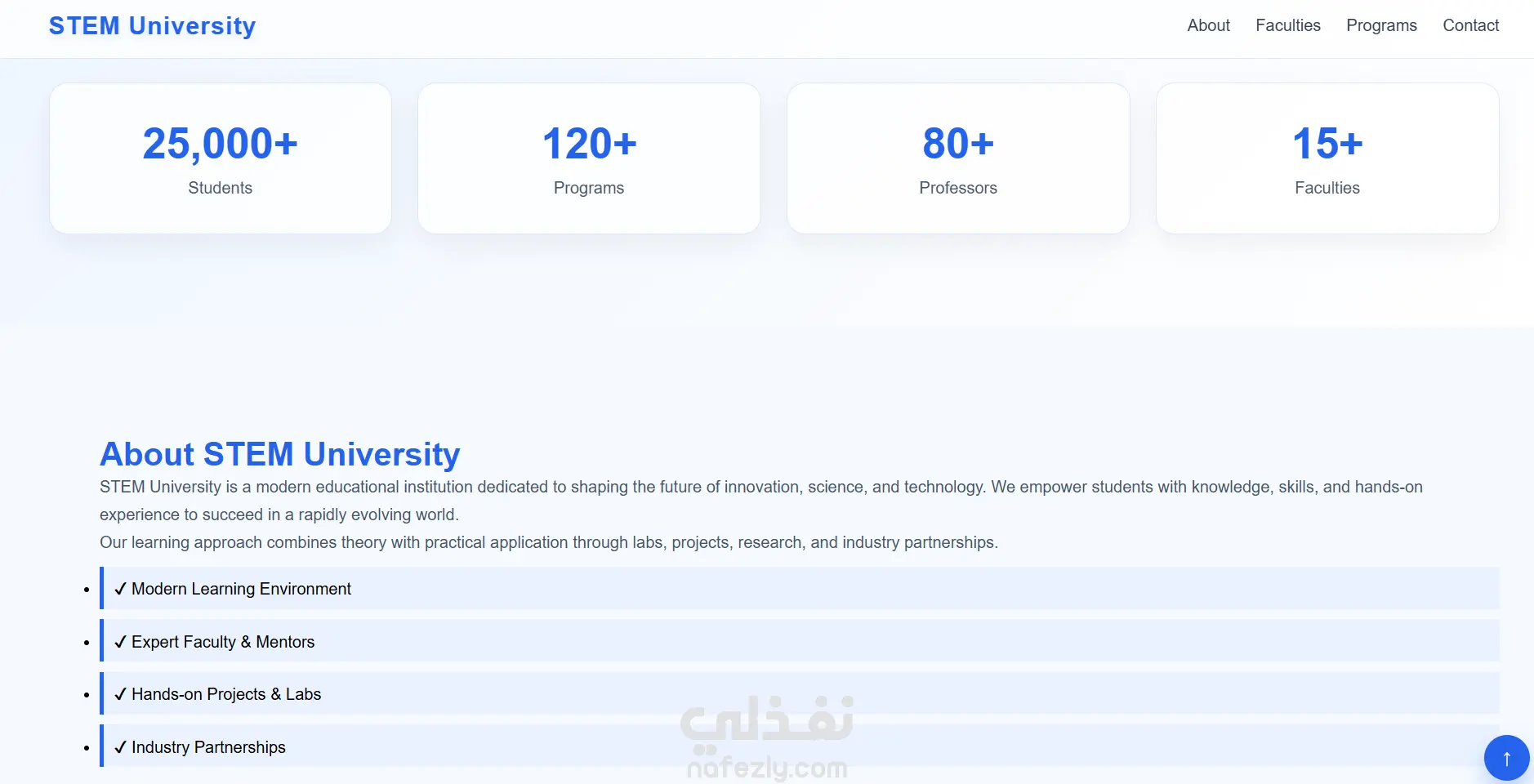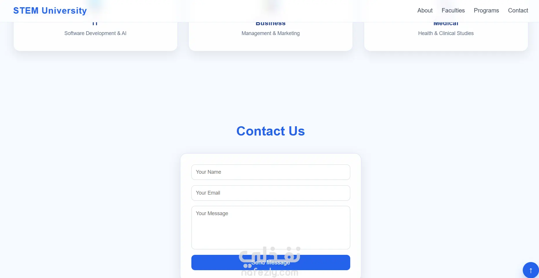 قمت بتصميم وتطوير صفحة هبوط (Landing Page) حديثة لجامعة STEM، بهدف عرض معلومات الجامعة بشكل احترافي وجذاب، مع التركيز على تجربة المستخدم وسهولة التصفح. 2.مميزات المشروع تصميم متجاوب بالكامل (موبايل – تابلت – كمبيوتر) واجهة مستخدم عصرية بألوان أكاديمية هادئة أنيميشن احترافي (عند التمرير + Hover Effects) Hero Section بصورة خلفية جذابة عدادات أرقام متحركة (Statistics Counter) عرض الكليات والبرامج بشكل كروت حديثة نموذج تواصل (Contact Form) زر للرجوع لأعلى الصفحة (Scroll to Top) تجربة مستخدم سلسة وسريعة 3.التقنيات المستخدمه HTML CSS3 (Flexbox & Grid) JavaScript (للتفاعلات والأنيميشن)