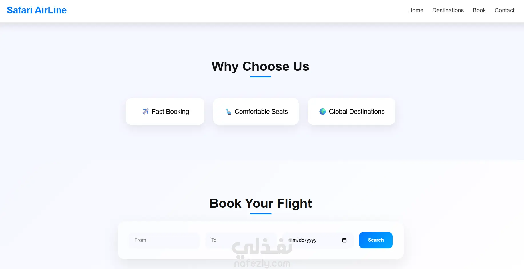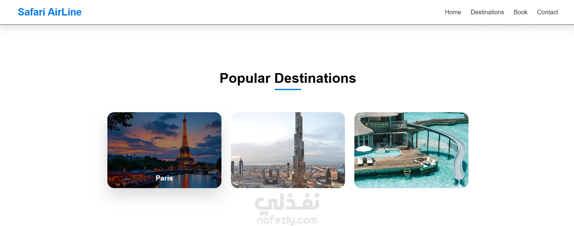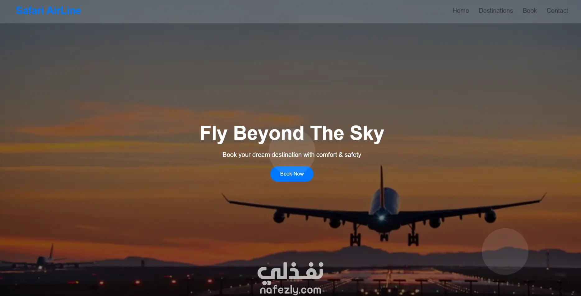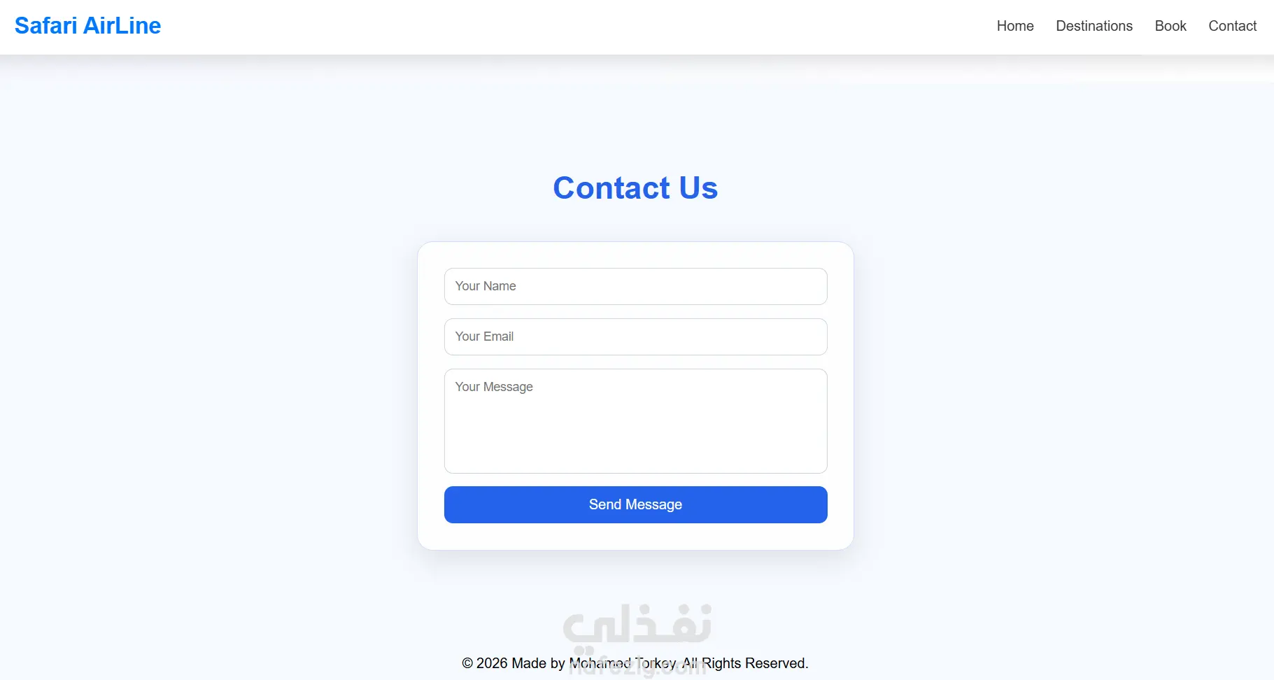 قمت بتصميم وتطوير صفحة هبوط (Landing Page) عصرية لشركة طيران، تهدف إلى تقديم تجربة مستخدم مميزة وسلسة مع تصميم جذاب واحترافي. الموقع يتميز بالسرعة وسهولة الاستخدام، بالإضافة إلى كونه متجاوب بالكامل مع جميع الأجهزة (موبايل – تابلت – كمبيوتر). مميزات المشروع تصميم حديث (Modern UI) مناسب لشركات الطيران والسفر متجاوب بالكامل مع جميع الشاشات (Responsive Design) Navbar تفاعلي مع قائمة موبايل (Sidebar Menu) حركة تنقل سلسة بين الأقسام (Smooth Scroll) Hero Section احترافي مع Animations قسم الوجهات (Destinations) مع تأثيرات Hover جذابة فورم حجز (Booking Form) بتصميم بسيط وسهل الاستخدام قسم تواصل (Contact) مع التحقق من البيانات (Validation) استخدام Animations خفيفة لتحسين تجربة المستخدم كود منظم ونظيف وسهل التعديل والتطوير التقنيات المستخدمه HTML5 CSS3 (Flexbox + Animations + Responsive) JavaScript (DOM + Events + Interactions) GSAP (لعمل Animations احترافية)
