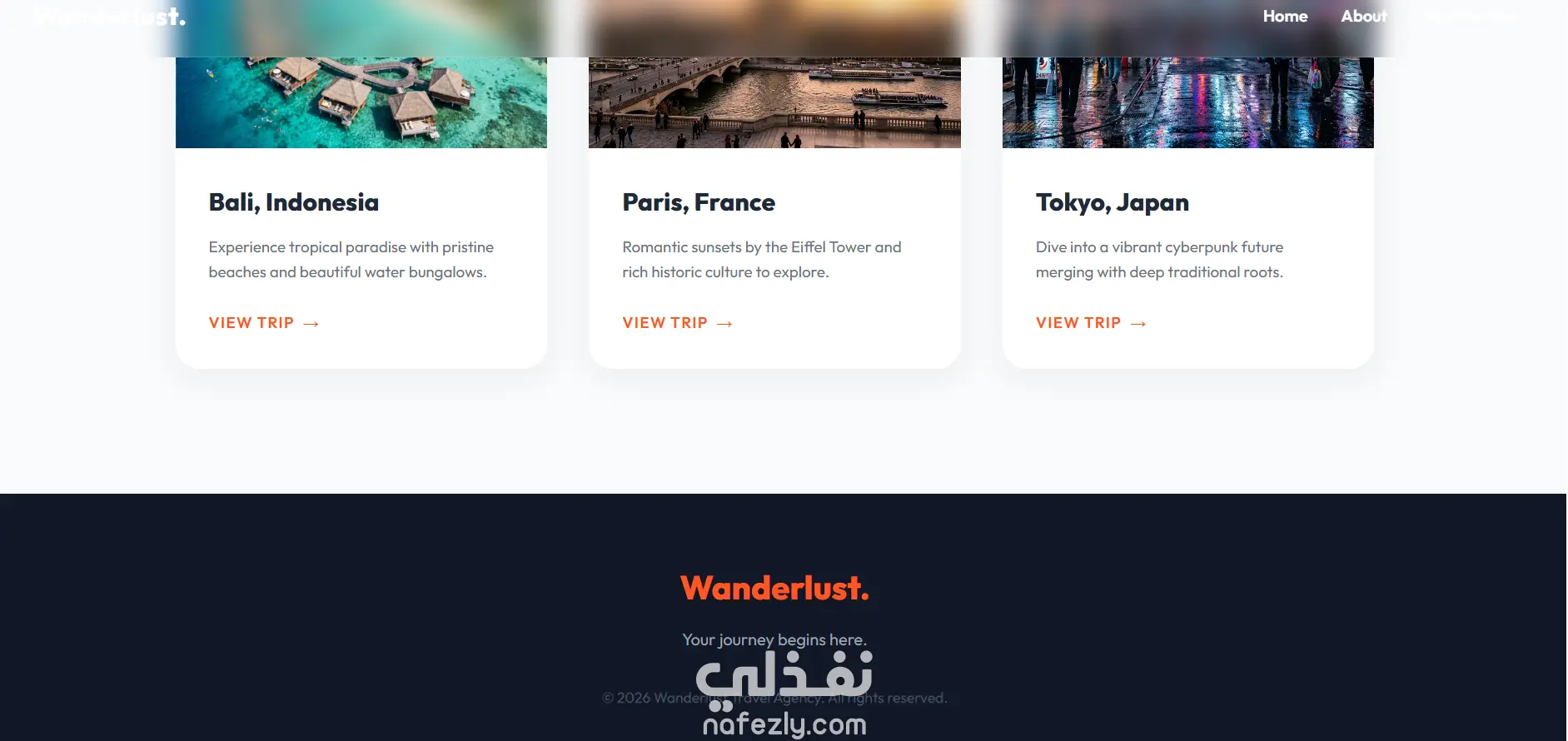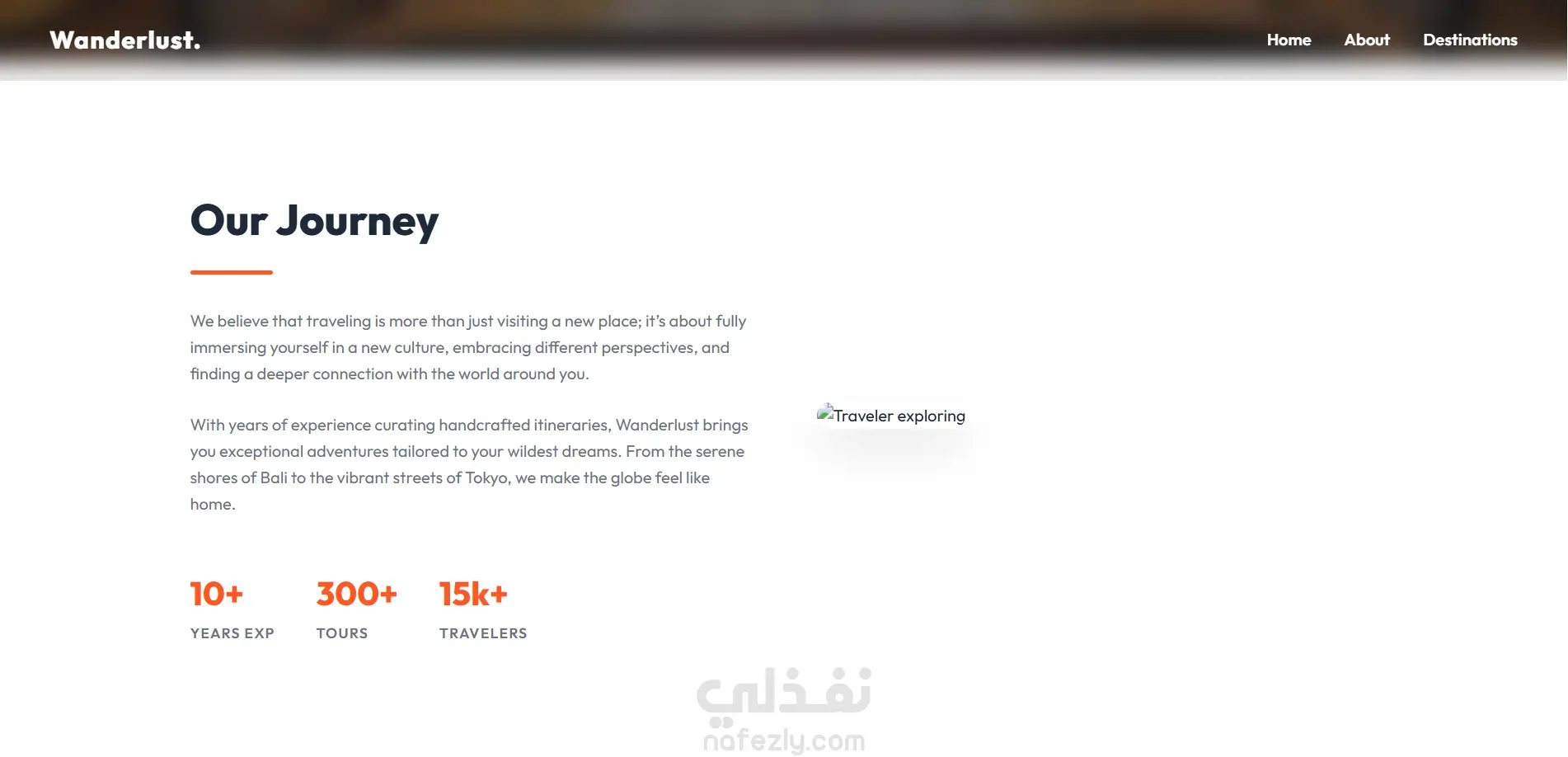 اقدّم لك تصميم وتطوير موقع سياحي احترافي (Landing Page) مشابه لفكرة موقع Wanderlust يعرض الوجهات السياحية بشكل جذاب وعصري، مع تجربة مستخدم سلسة ومتجاوبة على جميع الأجهزة (موبايل – تابلت – كمبيوتر).
