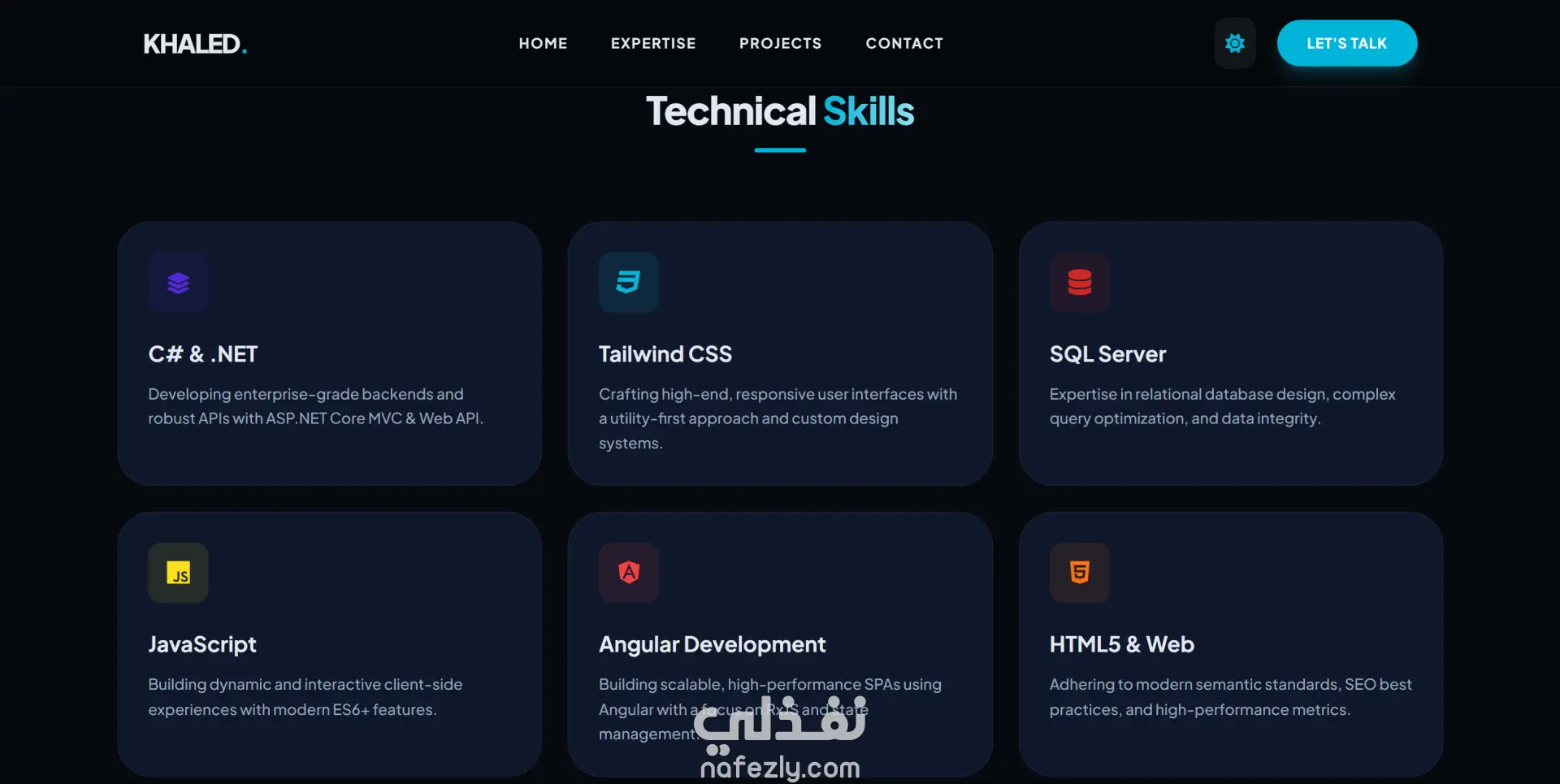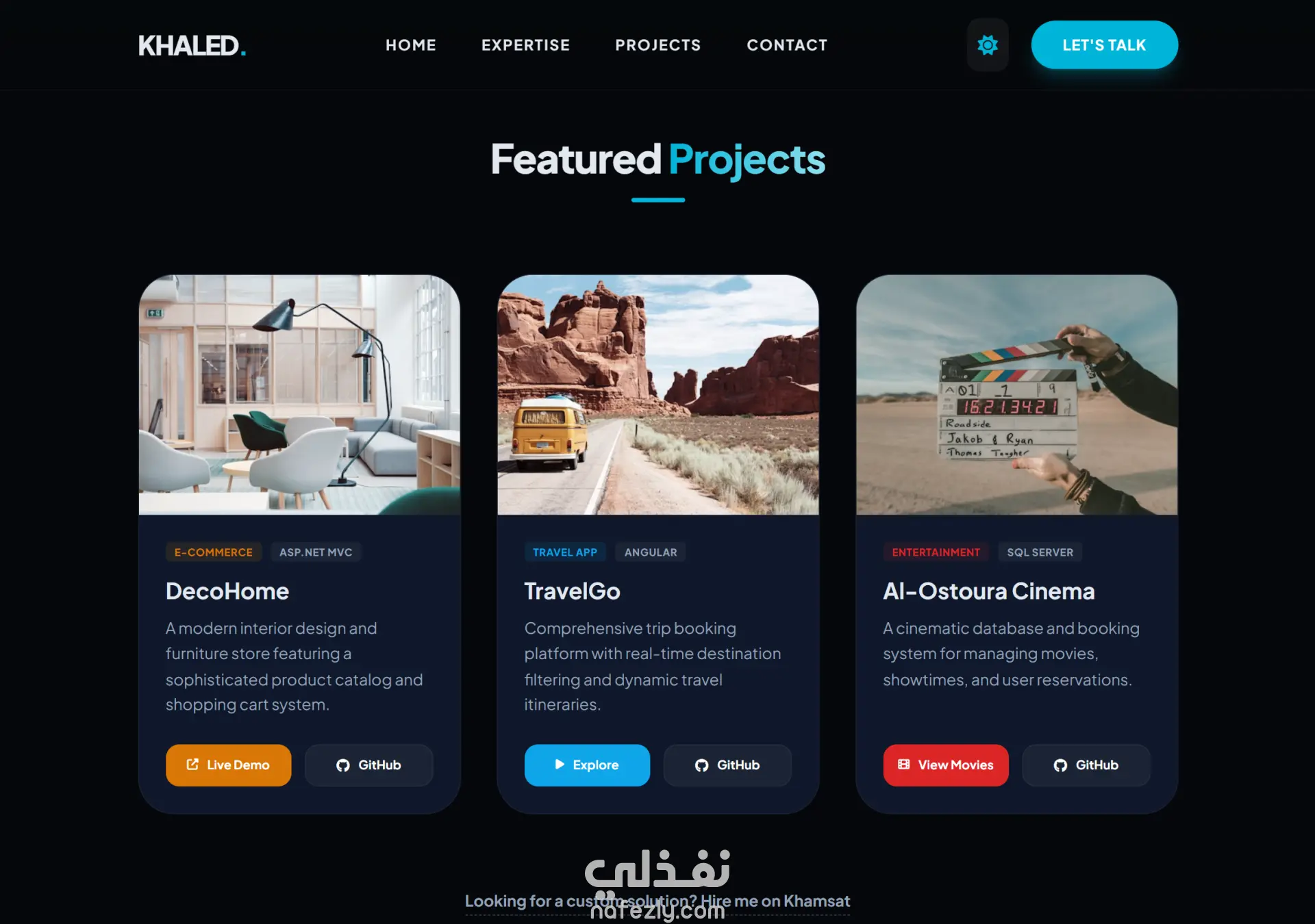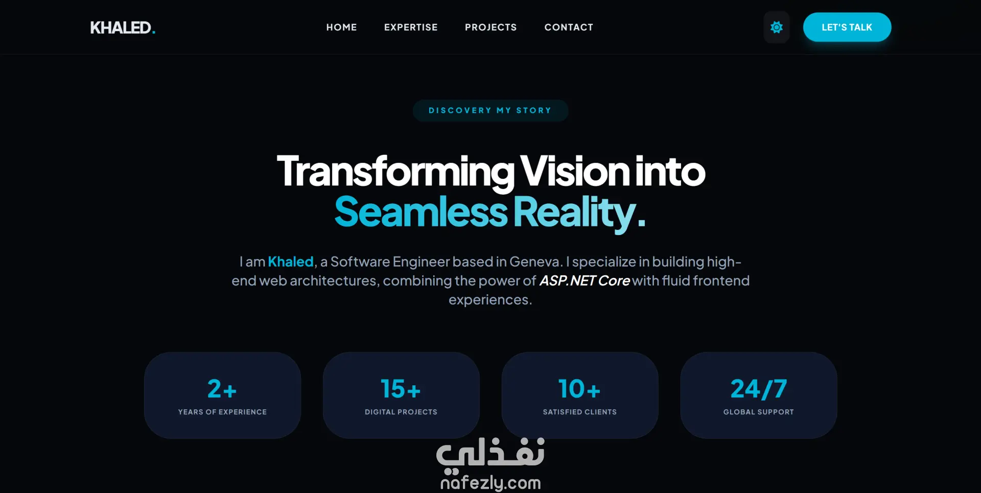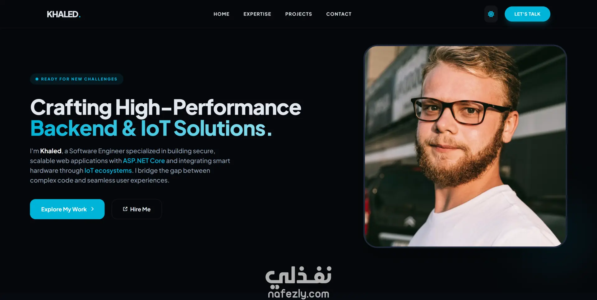 يعتبر هذا المشروع هو الواجهة الرقمية الخاصة بك لعالمنا الرقمي ، حيث قمت بتصميمه وتطويره ليعكس مهاراتي في الجمع بين قوة الأداء (Performance) وجماليات التصميم (Modern UI/UX). الموقع ليس مجرد صفحة تعريفية، بل هو تطبيق ويب متكامل يركز على تجربة المستخدم السلسة." أهم ما يميز المشروع: تصميم عصري (Ultra-Modern UI): استخدام نظام Tailwind CSS لبناء واجهة فريدة، بعيدة عن القوالب الجاهزة، مع دعم كامل للوضع الليلي (Dark Mode). سرعة استجابة فائقة: الموقع مصمم ليكون خفيفاً جداً لضمان التحميل الفوري، مع مراعاة قواعد الـ SEO لظهوره في محركات البحث. هذا البورتفوليو هو مجرد مثال بسيط لما يمكنني تنفيذه لك. إذا كنت تبحث عن مهندس برمجيات يهتم بـ أدق التفاصيل التقنية ويحول رؤيتك إلى واقع رقمي مبهر يجمع بين الأناقة والسرعة، فأنا جاهز لبدء العمل على مشروعك القادم التجاوب الكامل (Fully Responsive): تجربة تصفح مثالية على كافة أحجام الشاشات (موبايل، تابلت، كمبيوتر).