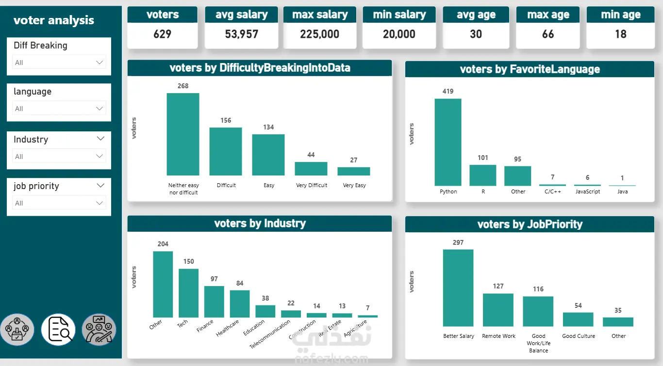 قمت بتصميم وتطوير لوحة تحكم تفاعلية لتحليل بيانات استبيان رأي الموظفين في قطاع التكنولوجيا والبيانات. أبرز ميزات المشروع: تحليل الرواتب والأعمار: حساب المتوسطات والحدود العليا والدنيا ديناميكياً. تحليل بيئة العمل: قياس مستويات الرضا عن (الإدارة، الرواتب، الزملاء، التوازن بين الحياة والعمل). تصفية ذكية وبيانات ديناميكية: تمكين المستخدم من الفلترة حسب الدولة والتعليم والجنس بضغطة زر. تصميم عصري (Modern UI): استخدام أيقونات وألوان احترافية لسهولة قراءة البيانات وسرعة اتخاذ القرار. الأدوات: Power BI + Power Query + DAX