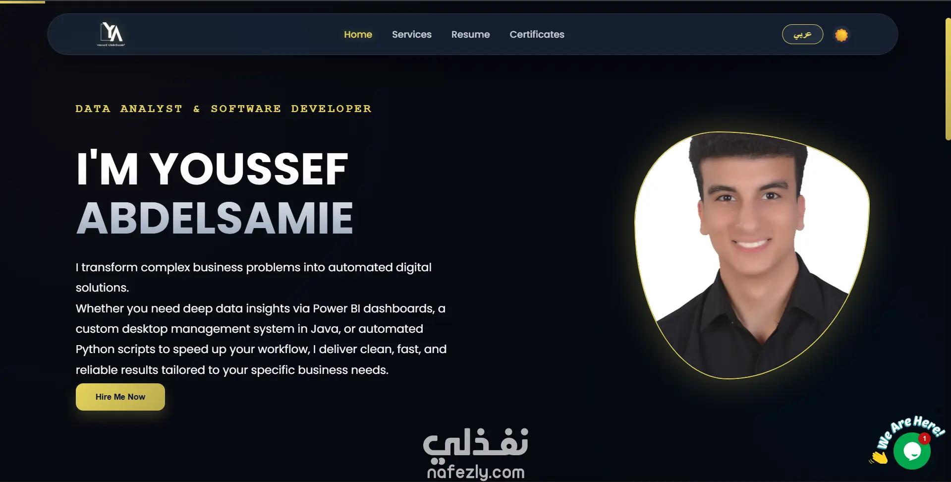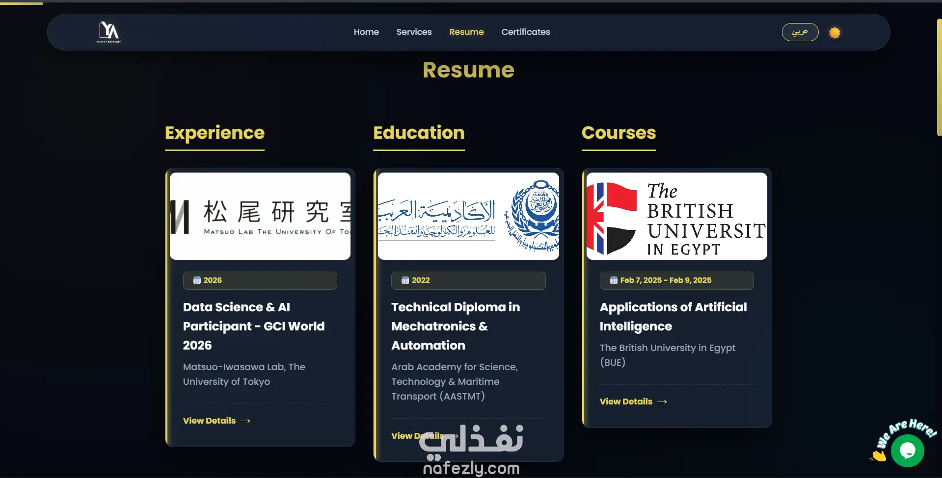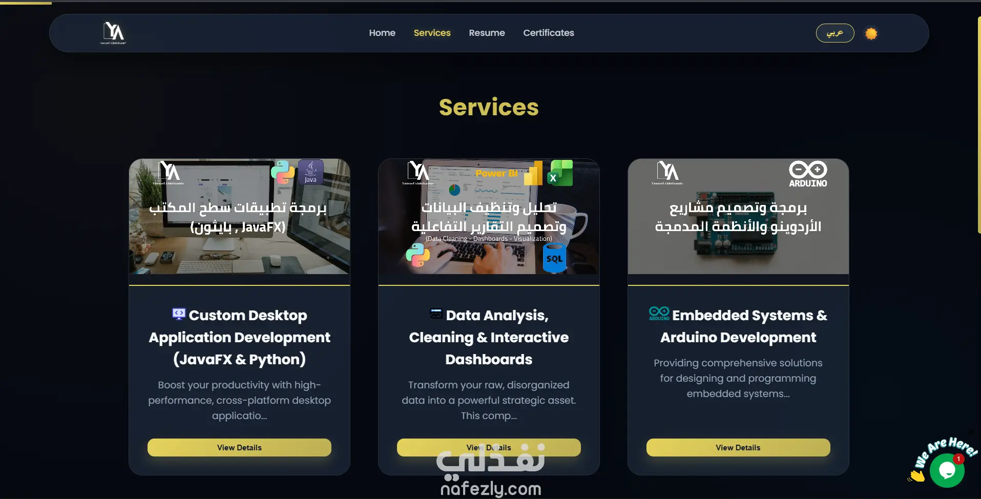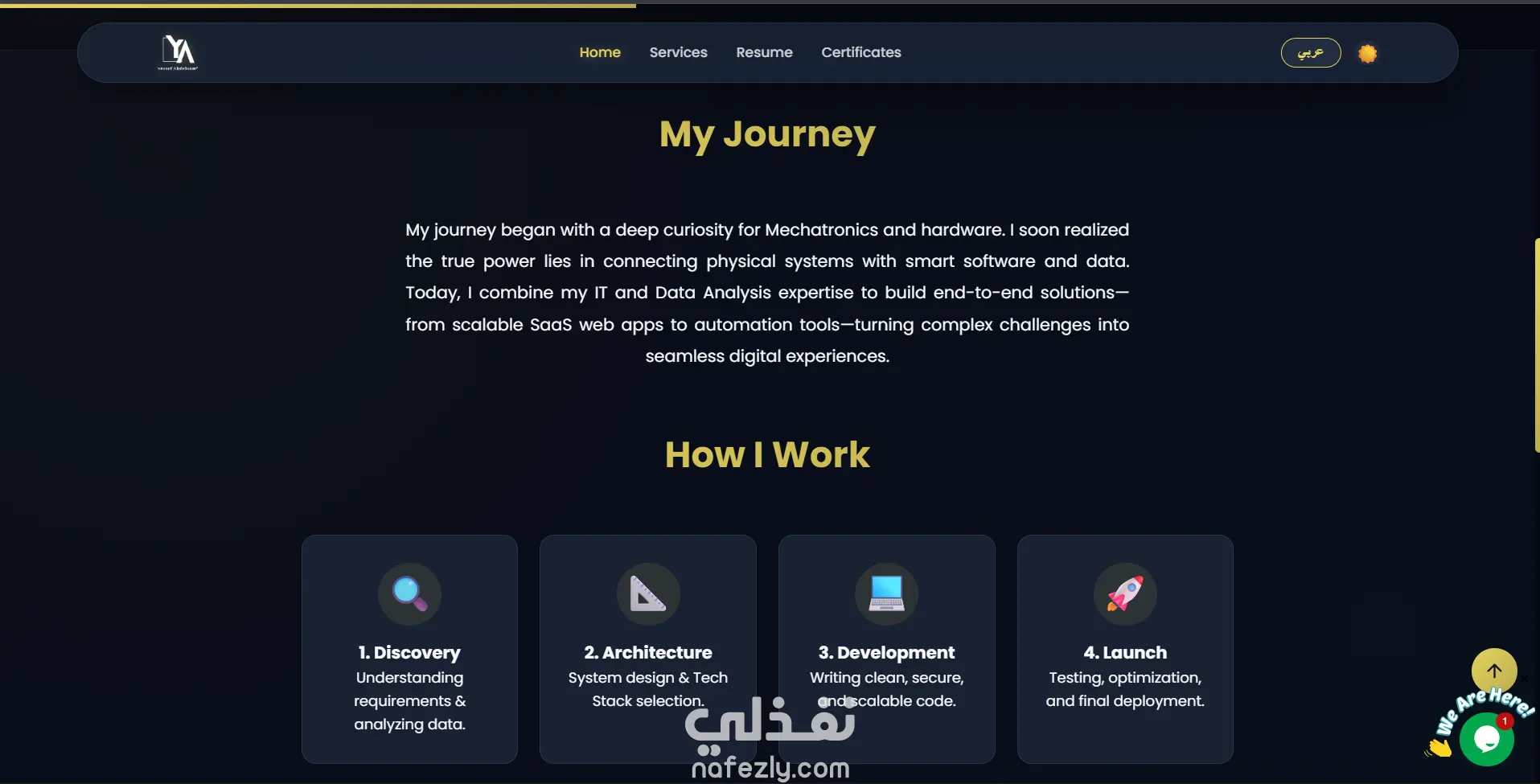 تصميم وتطوير موقع ويب شخصي (Portfolio) متكامل لعرض سابقة الأعمال، المهارات، والخدمات بشكل احترافي وجذاب. تم بناء الموقع ليكون بمثابة واجهة رقمية تعكس الهوية المهنية وتسهل تواصل العملاء. أبرز مميزات وخصائص الموقع: تصميم عصري وجذاب (UI/UX): واجهة مستخدم حديثة تضمن راحة العين وسلاسة التصفح. تجاوب كامل مع الشاشات (Responsive Design): الموقع يعمل بكفاءة وبشكل مثالي على جميع الأجهزة (الهواتف المحمولة، الأجهزة اللوحية، وشاشات الكمبيوتر). هيكلة منظمة للمحتوى: يحتوي على أقسام واضحة (من أنا، معرض المشاريع، المهارات التقنية، وطرق التواصل). كود نظيف وسريع (Clean Code & Performance): تم برمجة الموقع بأفضل الممارسات لضمان سرعة التحميل العالية والتوافق المبدئي مع محركات البحث (SEO).