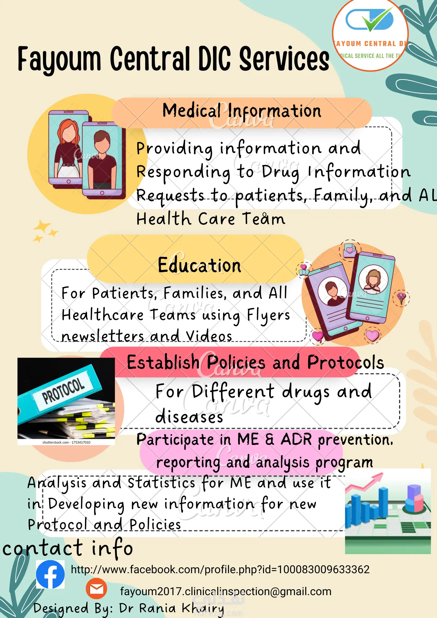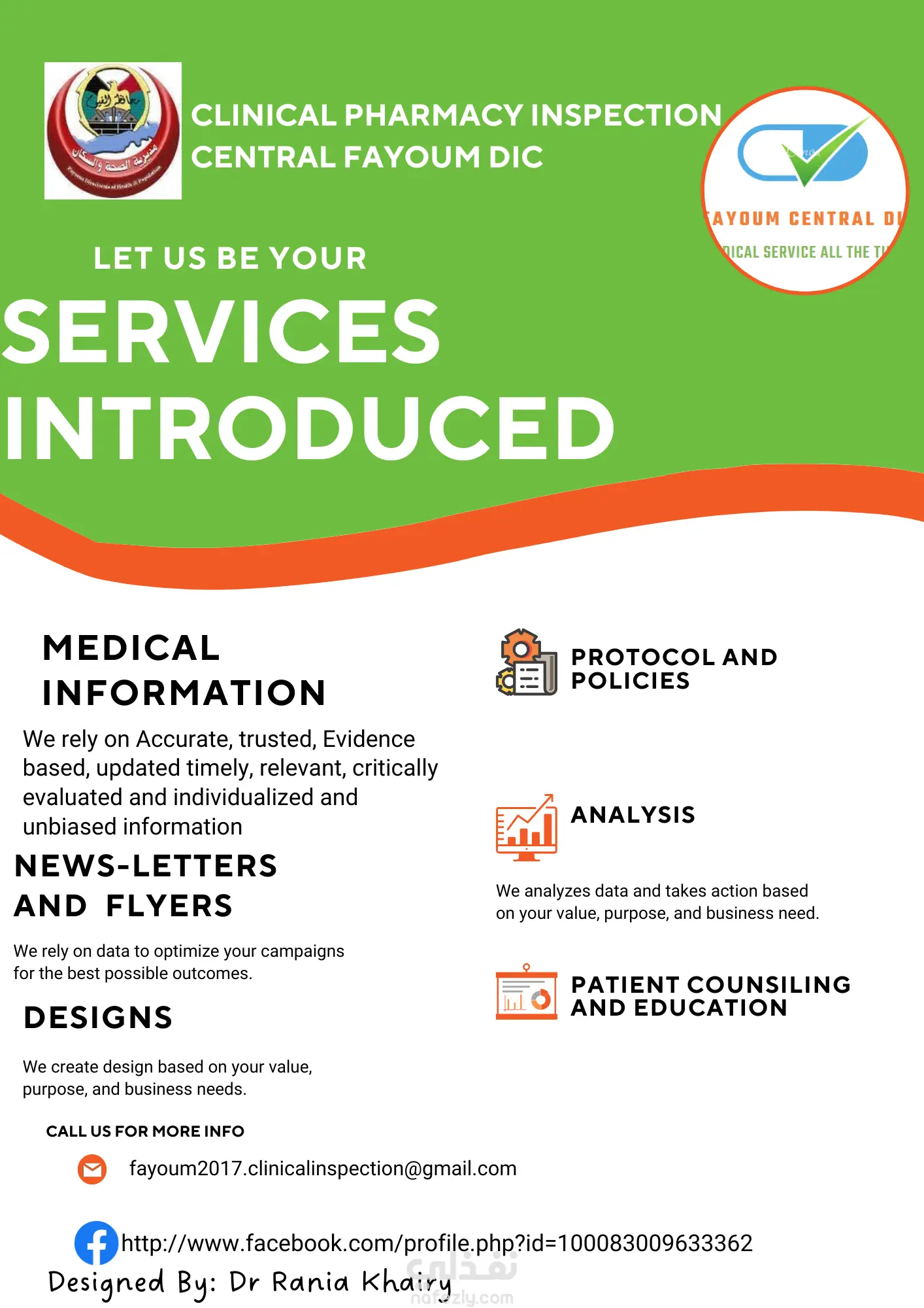 و أيضا تصميم انفوجرافيك يقدم المعلومة الطبية ببساطة للمريض او للعاملين بالقطاع الطبي على ان تعكس الالوان و التصميم بساطة و امأن و المخاطر الطبية إن وجدت بطريقة سلسة و سهلة لتكون معبره بأبسط الطرق عن المعلومة و الهدف
