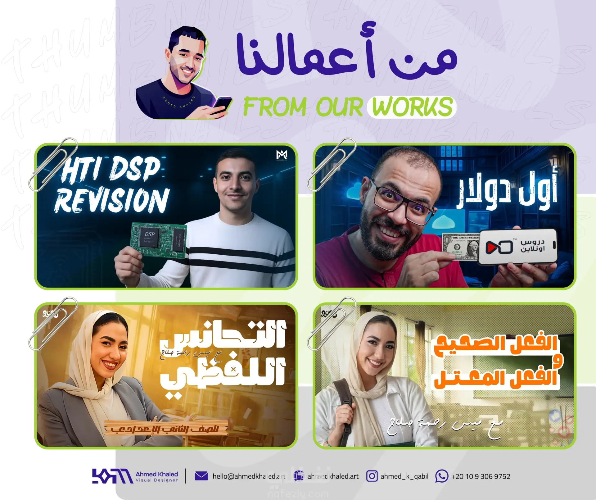 أنا أحمد خالد، أصمم لك (Thumbnail) ليست مجرد صورة، بل أداة تسويقية مبنية على تحليل سلوك المشاهد. بدمج أدوات الفوتوشوب مع حس فني بسيط وعميق، أحول فكرة الفيديو إلى واجهة بصرية تضمن لك التميز في صفحة اليوتيوب الرئيسية.