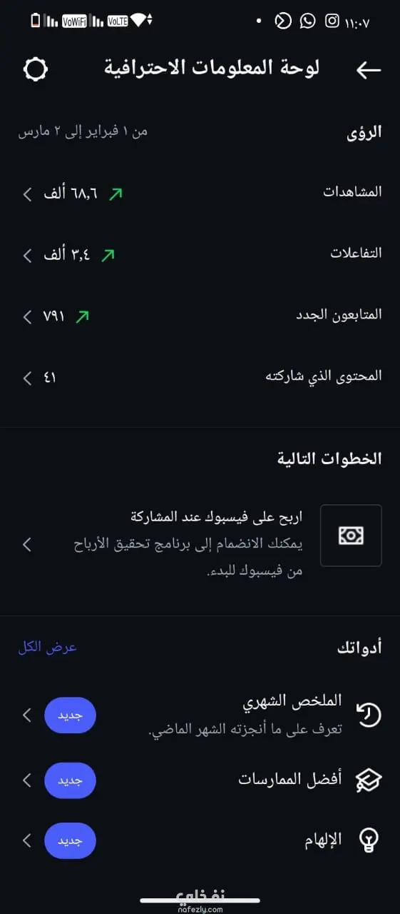 خلال الفترة من 2 فبراير إلى 2 مارس حقق الحساب نموًا ملحوظًا في مؤشرات الأداء، حيث وصل إلى: 68.6 ألف مشاهدة 3.4 ألف تفاعل 791 متابع جديد نشر 41 قطعة محتوى جميع المؤشرات أظهرت اتجاهًا تصاعديًا، مما يعكس فاعلية استراتيجية المحتوى، وتحقيق وصول وانتشار قوي خلال فترة زمنية قصيرة. النتائج توضح القدرة على إدارة المحتوى باحترافية، وتحليل الأداء، وتحسين التفاعل وبناء جمهور متنامٍ بشكل مستمر