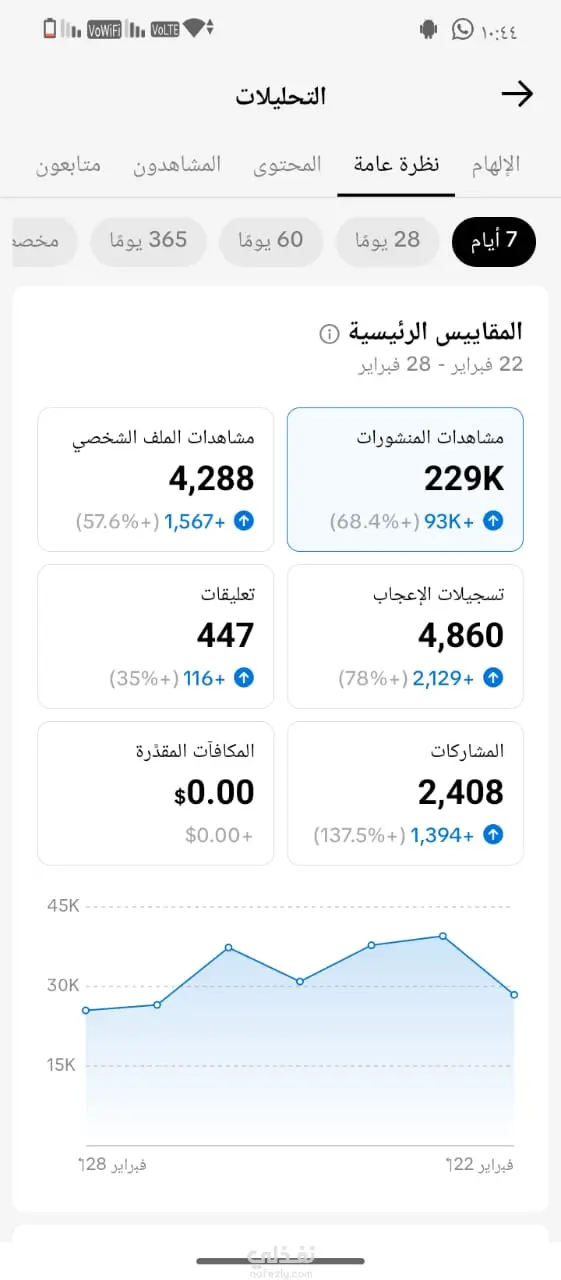 خلال أسبوع واحد فقط حقق الحساب: • 229 ألف مشاهدة • 4,860 إعجاب • 2,408 مشاركة • 447 تعليق زيادة تجاوزت 68% في المشاهدات و137% في المشاركات ? استراتيجية محتوى مبنية على تحليل الجمهور والترندات = انتشار أسرع وتفاعل أعلى �