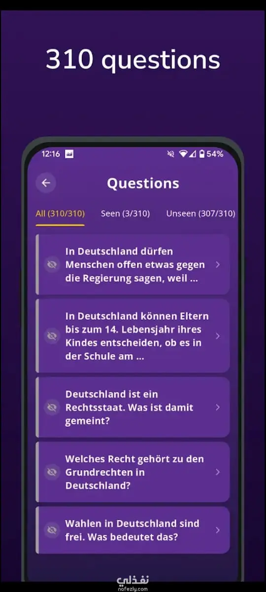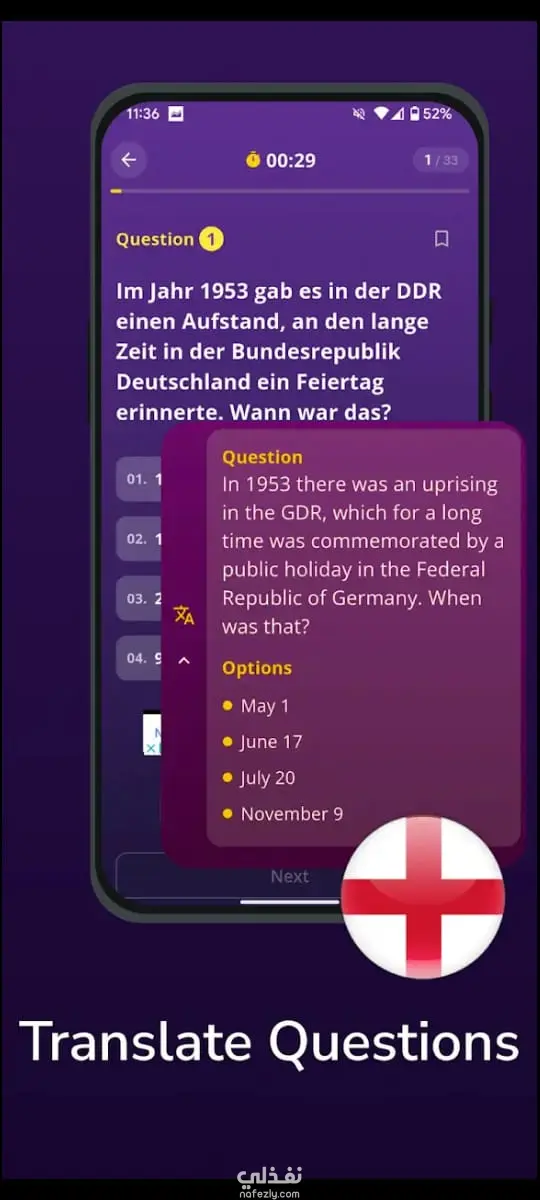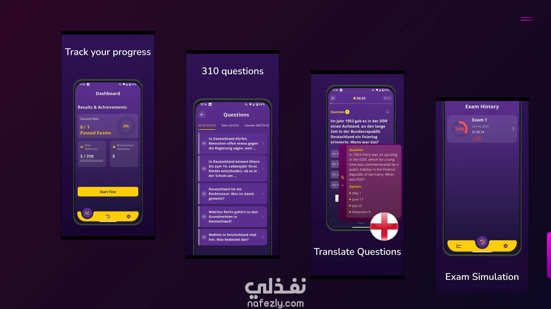 تطبيق تعليمي ذكي ومتطور تم تصميمه وبرمجته لمساعدة المستخدمين في التحضير لاختبار الجنسية الألمانية. التطبيق يدعم لغات متعددة (Multilingual Support) ويوفر أسئلة تفاعلية مع نظام دقيق لتتبع تقدم المستخدم (Progress Tracking) وتقديم تحليلات للأداء (Analytics). تم تصميم واجهة المستخدم لتكون بديهية (Intuitive Design) لضمان أفضل تجربة.