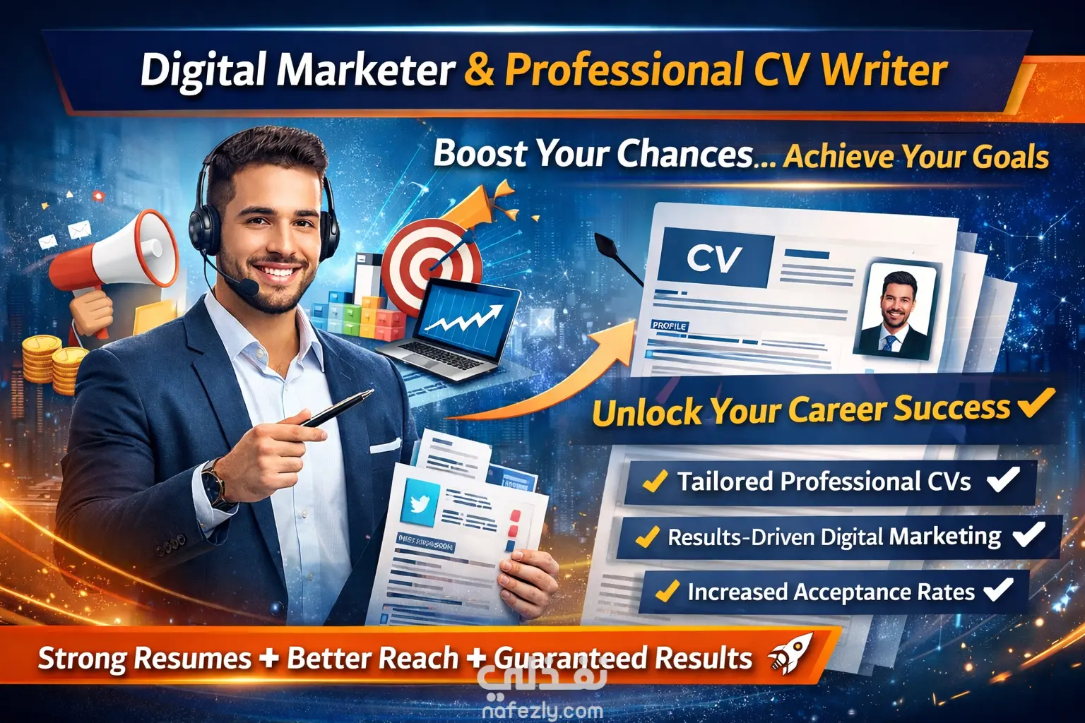 هل تبحث عن زيادة فرصك في الحصول على وظيفة أو جذب عملاء أكثر؟ أنا هنا لأساعدك. أقدم لك خدمة احترافية تجمع بين التسويق الذكي وإنشاء سير ذاتية قوية مصممة خصيصًا لتمييزك عن المنافسين.