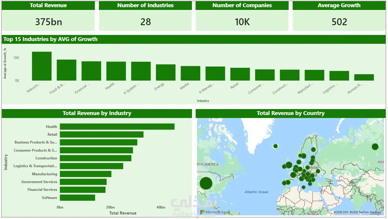 قمت بتصميم وتطوير لوحة بيانات (Dashboard) تفاعلية باستخدام Microsoft Power BI لصالح شركة تمتلك فروعًا في الولايات المتحدة وأوروبا، بهدف تحليل الأداء المالي ومعدلات النمو عبر مختلف القطاعات. تفاصيل العمل جمع البيانات من ملفين Excel تنظيف البيانات (Data Cleaning) ومعالجة القيم الناقصة تنفيذ عمليات Data Transformation دمج البيانات (Data Merging) في نموذج موحد بناء نموذج بيانات احترافي (Data Modeling) إنشاء مقاييس (Measures) باستخدام DAX تصميم Dashboard تفاعلي وسهل الاستخدام مميزات الداشبورد عرض إجمالي الإيرادات (Total Revenue) بشكل واضح تحليل عدد الصناعات والشركات مقارنة متوسط النمو بين أكثر من 15 صناعة عرض الإيرادات حسب القطاع (Industry-wise Revenue) خريطة تفاعلية توضح توزيع الإيرادات حسب الدولة تصميم بصري احترافي مناسب لاتخاذ القرار