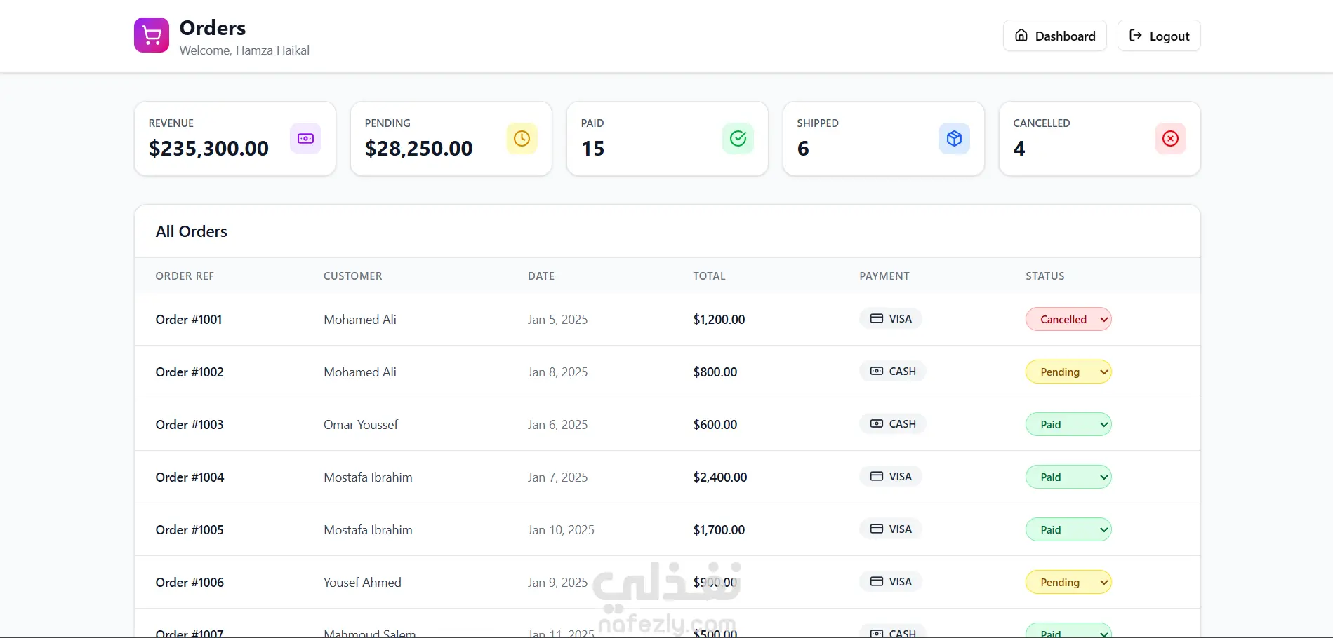Admin Dashboard — Role-Based Management System لوحة تحكم احترافية مبنية باستخدام React 18 و TypeScript و Tailwind CSS، مصممة لإدارة المستخدمين والطلبات بنظام صلاحيات متقدم (Role-Based Access Control) مع تجربة استخدام محسوبة Mobile-First. المشروع بيحاكي سيناريو إنتاج حقيقي لإدارة نظام طلبات ومستخدمين داخل شركة أو متجر إلكتروني. الفكرة الأساسية بناء Admin Panel متكامل يوفر: نظام صلاحيات متعدد المستويات (Super Admin / Admin / User) إدارة كاملة للطلبات وحالاتها إدارة المستخدمين والتحكم في الأدوار تجربة استخدام احترافية متجاوبة 100% تنظيم كود قابل للتوسع والصيانة دوري في المشروع تصميم الـ Architecture بالكامل باستخدام React + Vite تطبيق نظام Role-Based Access Control عملي تنظيم الـ API Layer باستخدام Axios إدارة Server State باستخدام TanStack Query بناء UI نظيف ومتجاوب بدون أي Horizontal Scroll تصميم تجربة Mobile محسنة بواجهات Card بدل الجداول فصل Types وتنظيم Structure احترافي للمشروع أبرز المميزات التقنية نظام صلاحيات متقدم 3 أدوار مختلفة بصلاحيات حقيقية منع التعديل حسب الدور تحكم كامل في حالة الحساب (Active / Blocked) منع الأدمن من تعديل نفسه إدارة الطلبات تتبع حالة الطلب (Pending / Paid / Shipped / Cancelled) تعديل الحالة حسب الصلاحيات عرض إحصائيات الطلبات عرض الإيرادات للأدمن فقط إدارة المستخدمين تغيير الدور تفعيل أو حظر الحساب منع الأدمن من تعديل أدمن آخر تجربة استخدام محسوبة Mobile Card Layout بدل Table Bottom Navigation للموبايل Hamburger Menu Sticky Headers Touch-Friendly UI Responsive Grid System التقنيات المستخدمة React 18 TypeScript Vite Tailwind CSS TanStack Query React Context Axios JSON Server (Mock API) القيمة اللي بيعكسها المشروع المشروع ده يوضح قدرتي على: بناء نظام إدارة كامل مش مجرد صفحات تطبيق Business Logic حقيقي داخل الواجهة التعامل مع الصلاحيات المعقدة تنظيم مشروع React بشكل احترافي قابل للتوسع الاهتمام بتجربة الموبايل بنفس قوة الديسكتوب