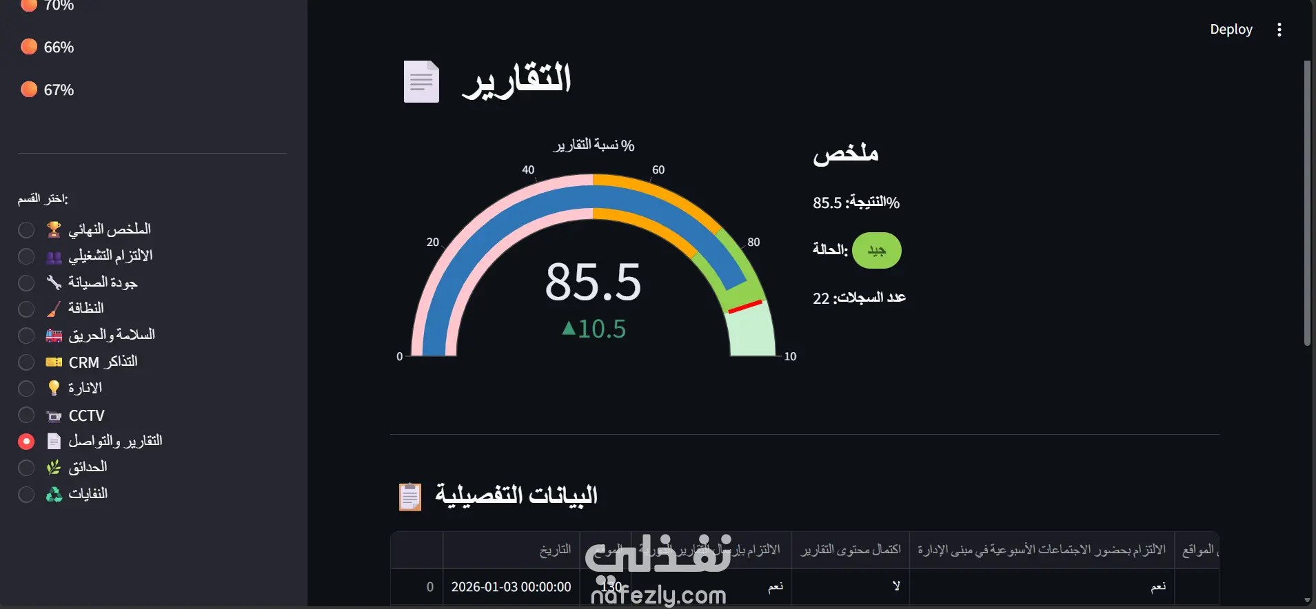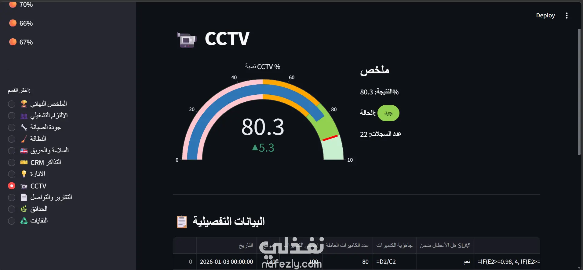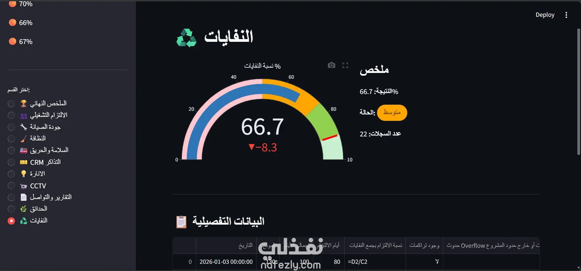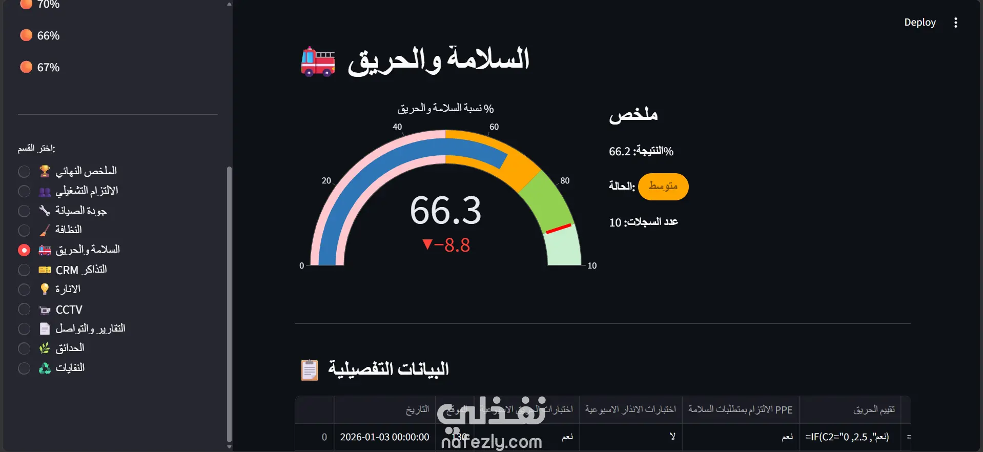 يعمل في المتصفح 11 صفحة: - الملخص النهائي - الالتزام التشغيلي - جودة الصيانة - النظافة - السلامة والحريق - CRM - الإنارة - CCTV - التقارير - الحدائق - النفايات