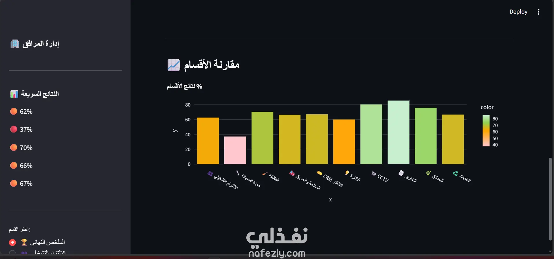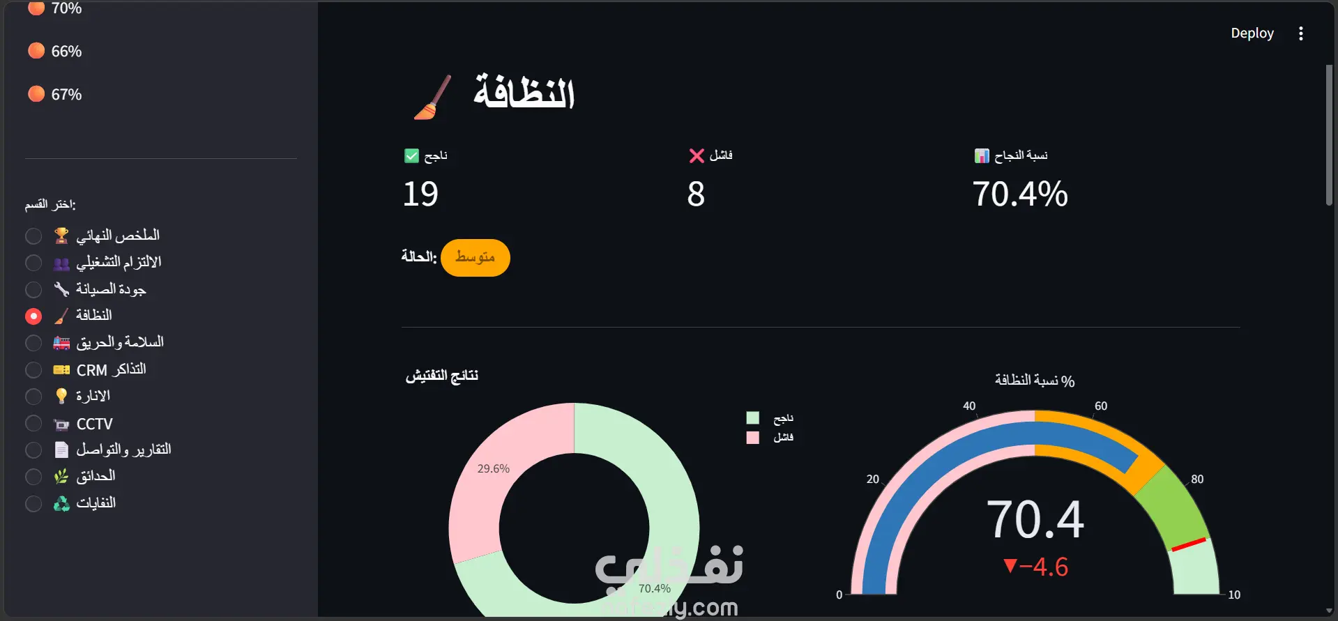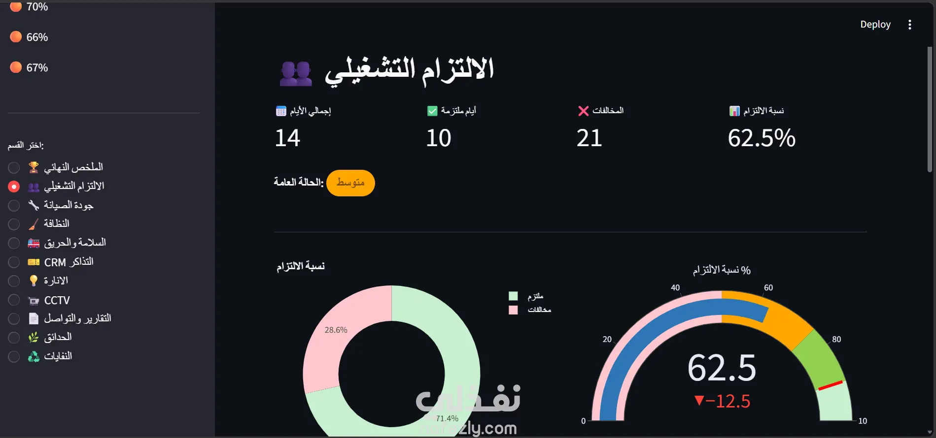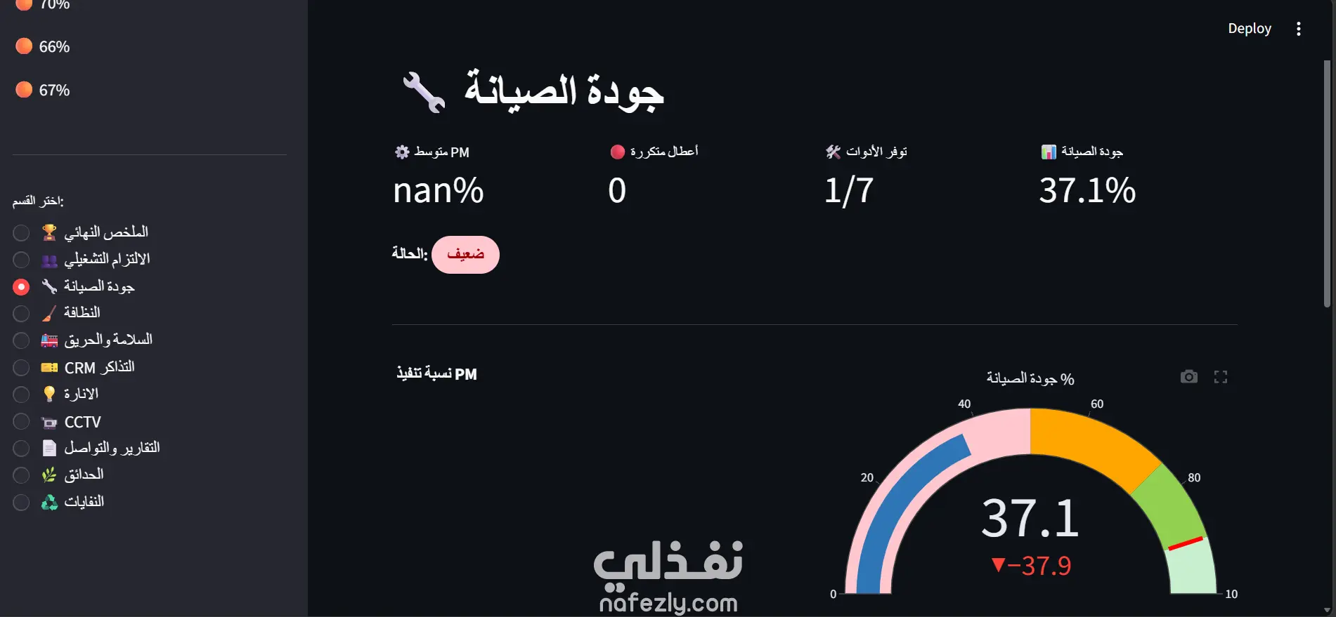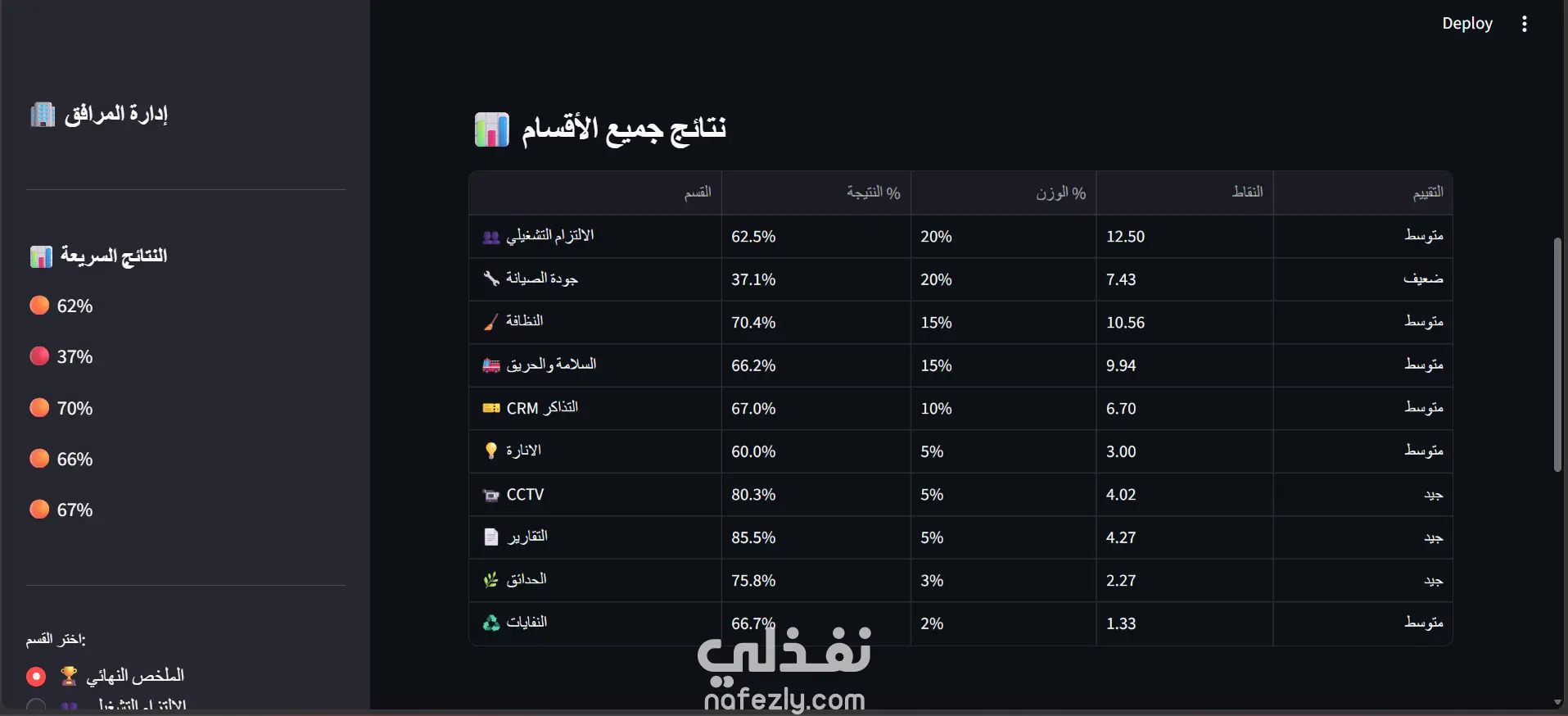 يعمل في المتصفح 11 صفحة: - الملخص النهائي - الالتزام التشغيلي - جودة الصيانة - النظافة - السلامة والحريق - CRM - الإنارة - CCTV - التقارير - الحدائق - النفايات