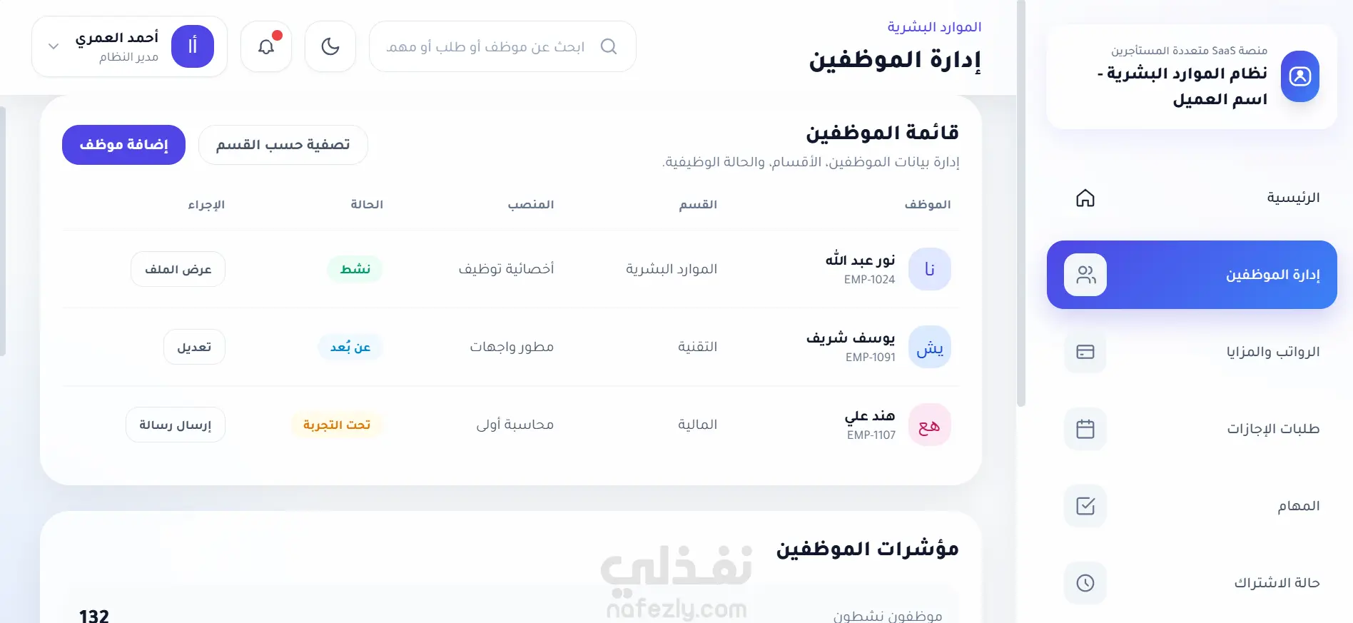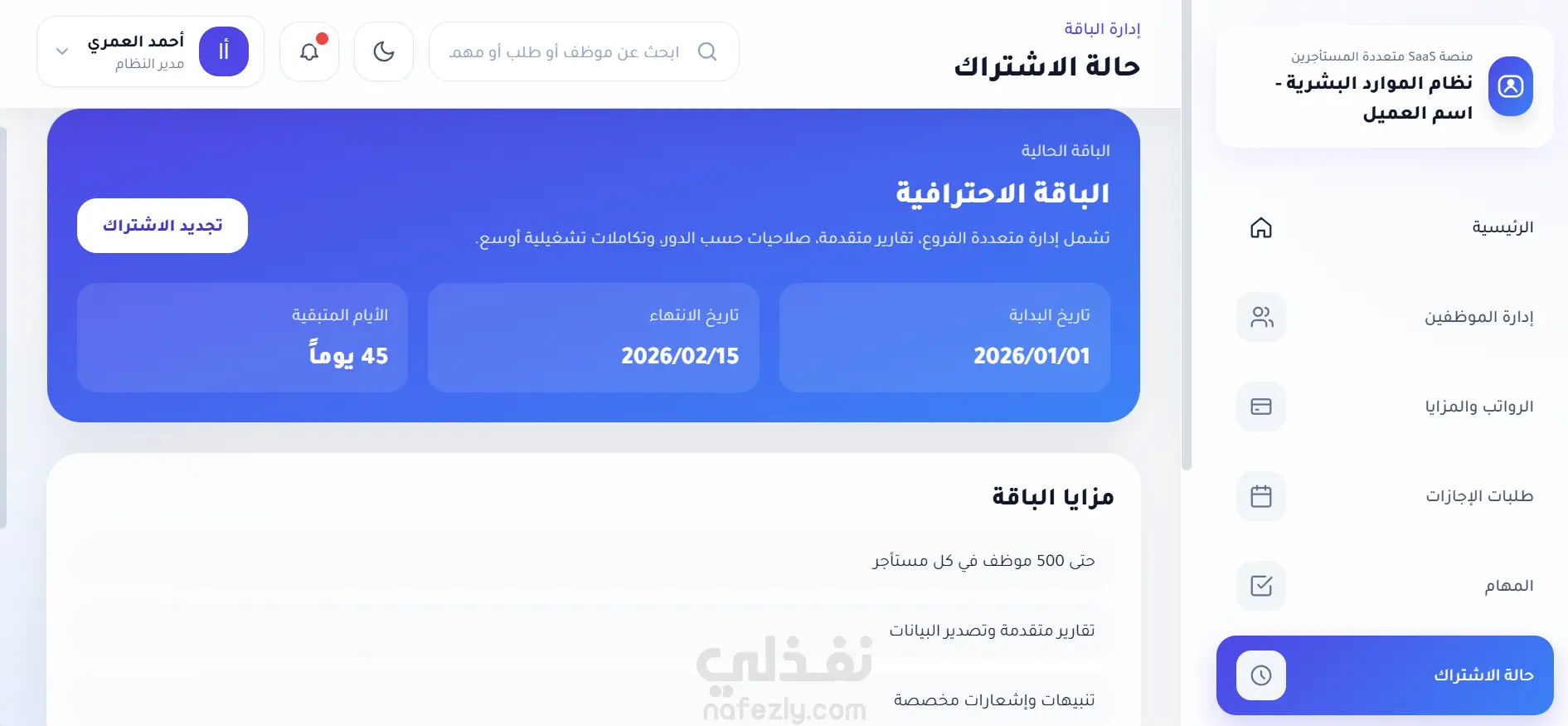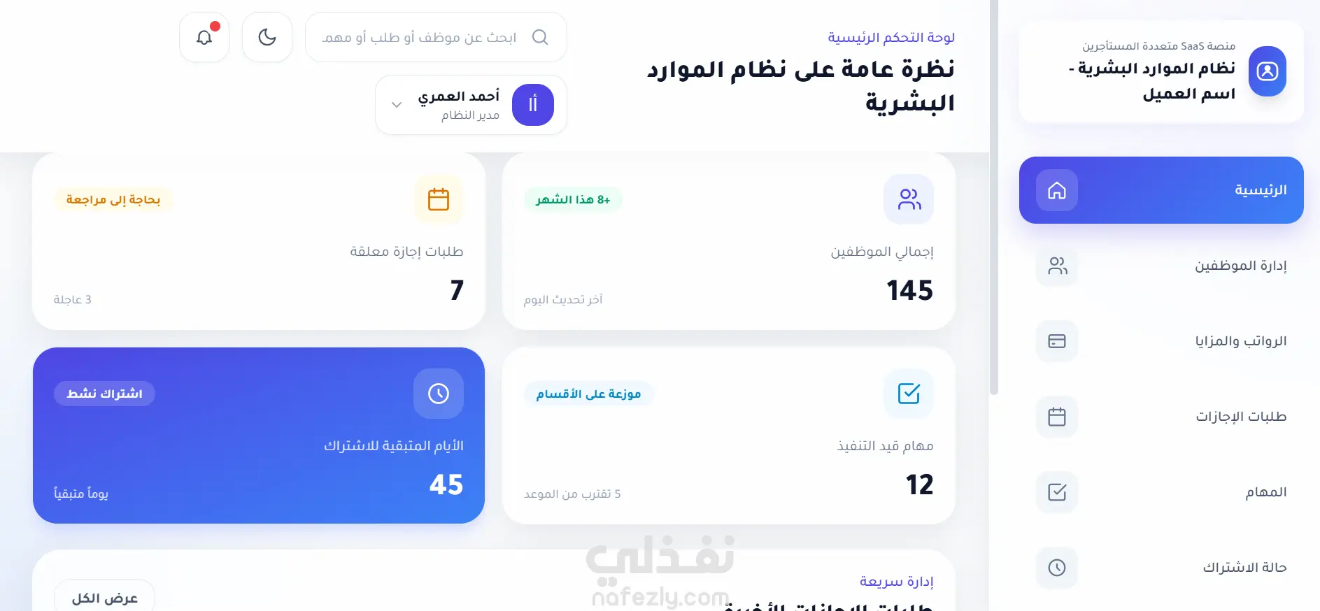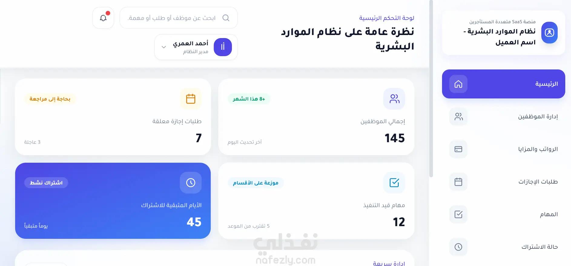 تصميم وتطوير نظام إداري حديث ومتكامل لإدارة الموارد البشرية (HR)، مبني بنموذج البرمجيات كخدمة (SaaS) ليكون متعدد المستأجرين (Multi-tenant). النظام موجه للشركات والمؤسسات لإدارة فروعها أو عملائها داخل منصة واحدة، مع دعم كامل للغة العربية وتوجيه من اليمين إلى اليسار (RTL).