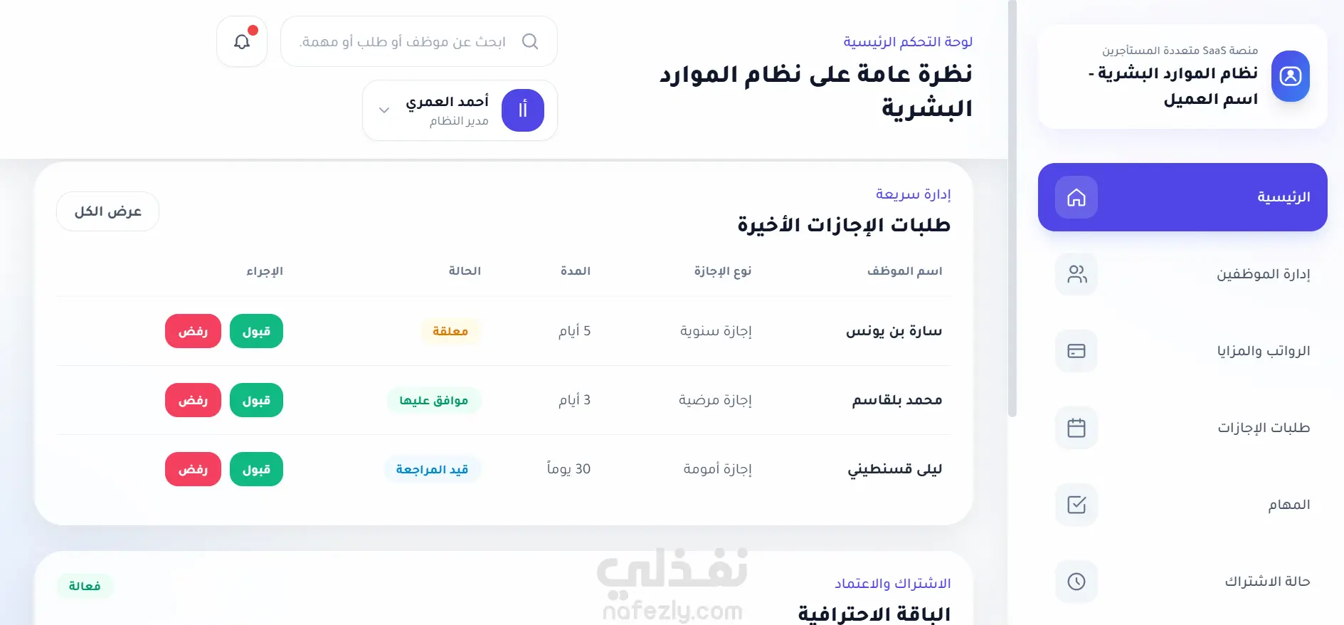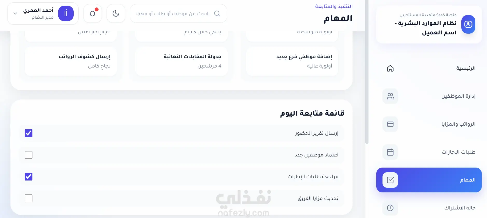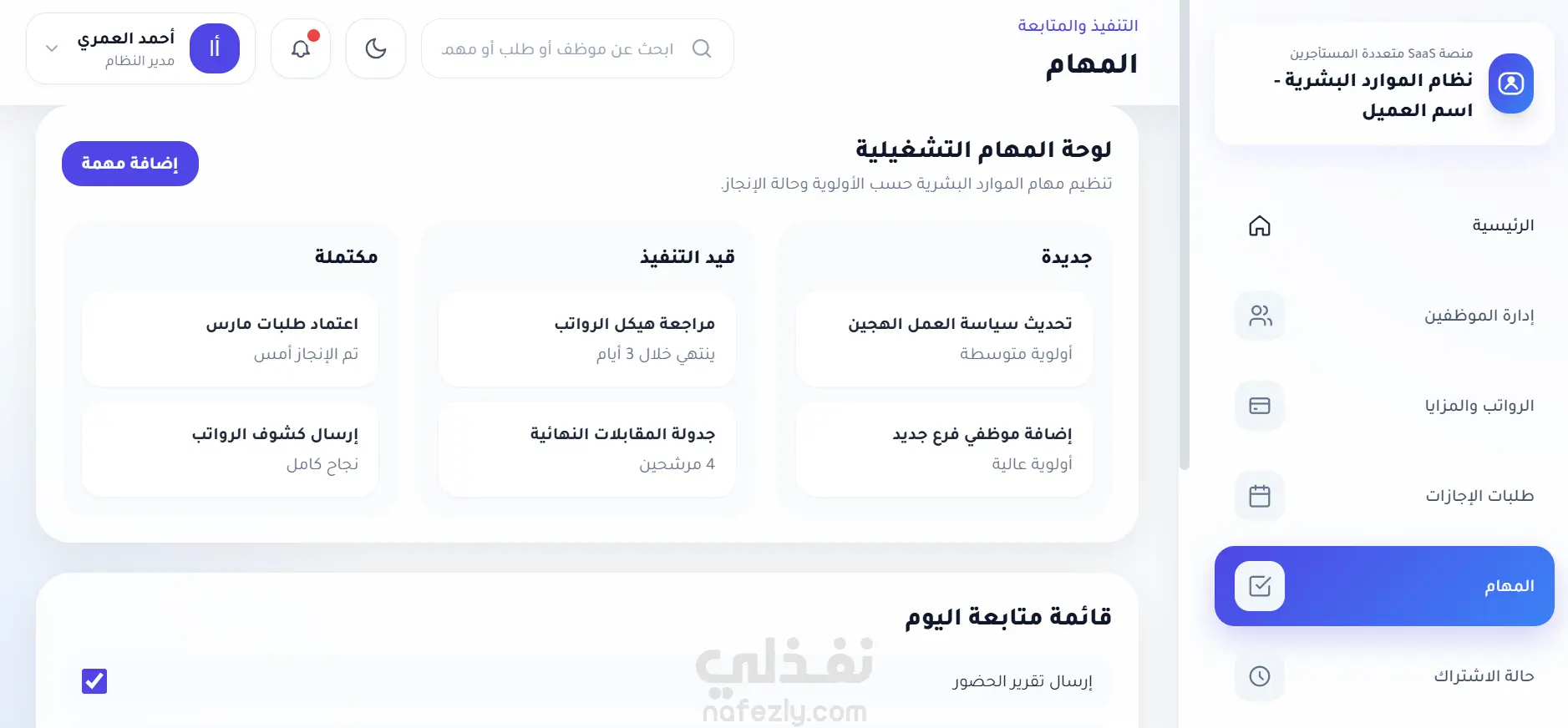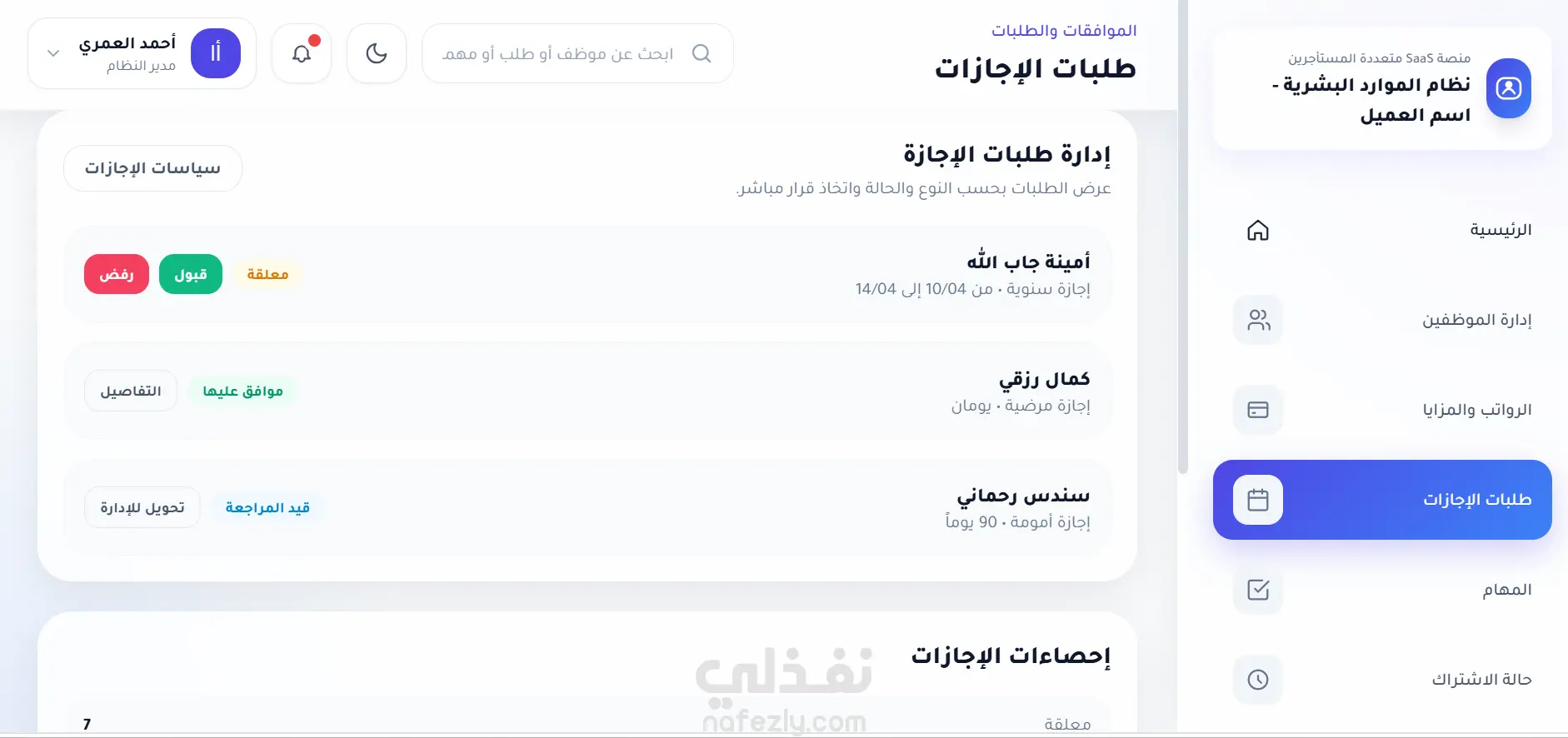 • الإجازات والمهام: نظام مبسط لمتابعة طلبات الإجازات (قبول/رفض) ولوحة لتنظيم سير عمل المهام اليومية.
