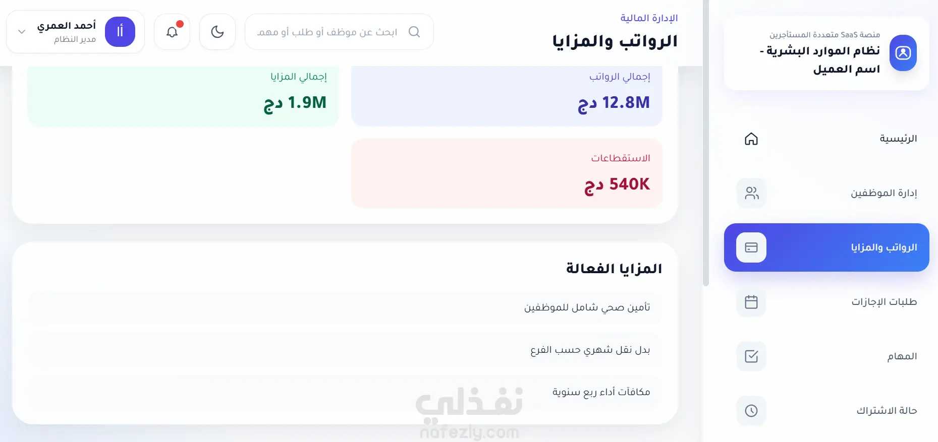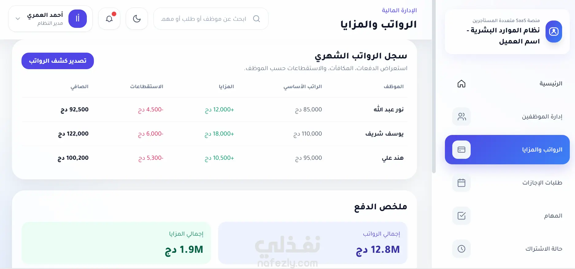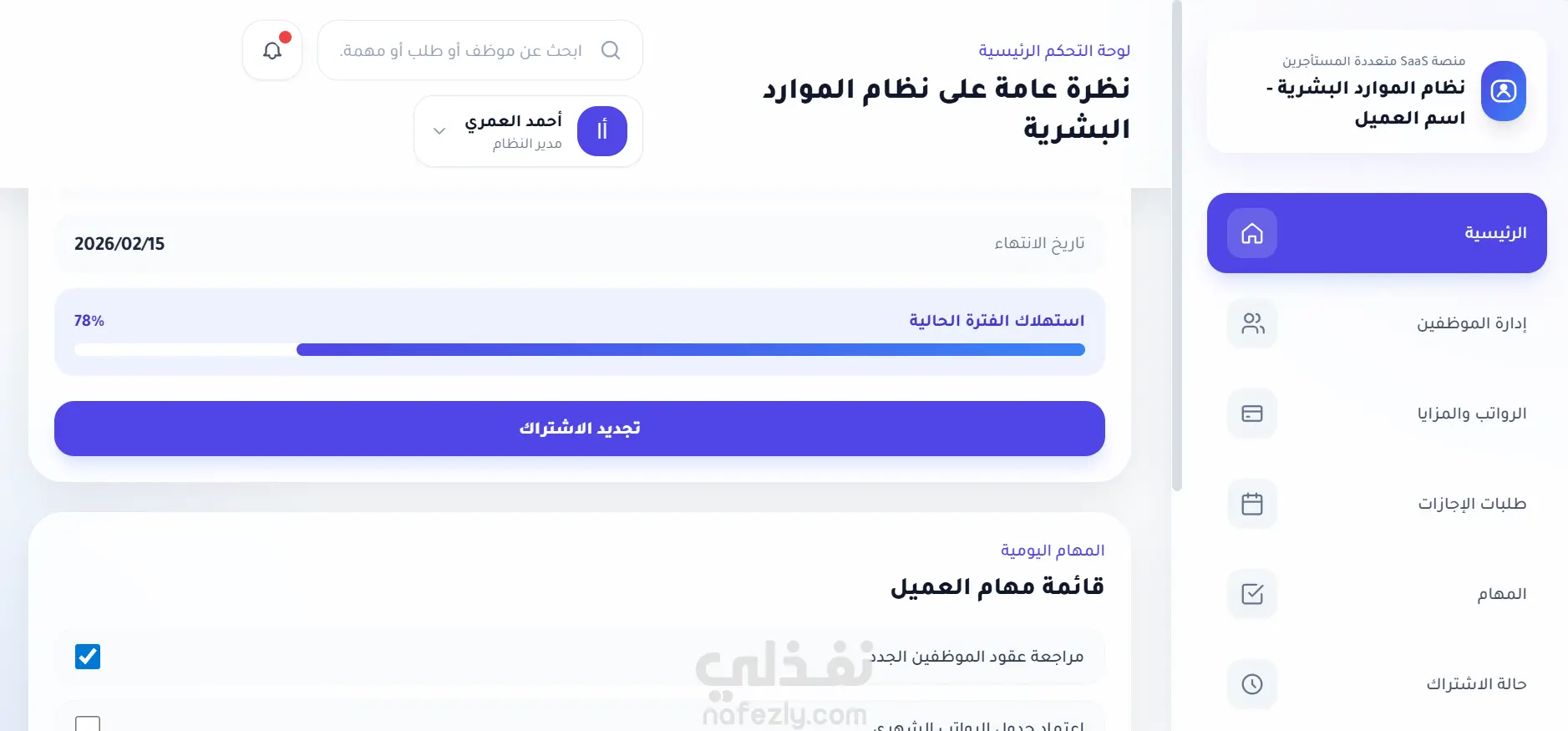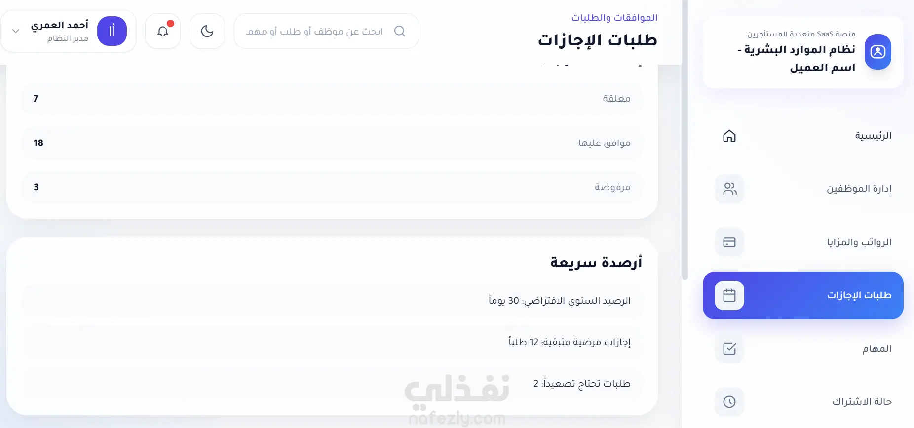 • الإجازات والمهام: نظام مبسط لمتابعة طلبات الإجازات (قبول/رفض) ولوحة لتنظيم سير عمل المهام اليومية.