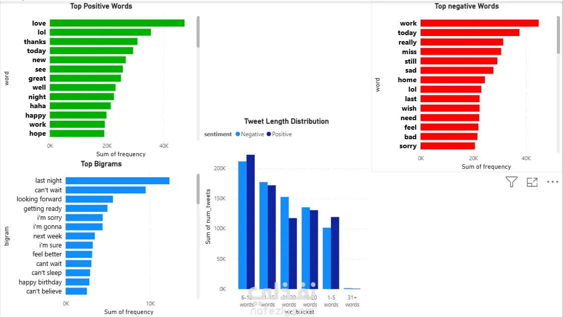 • اكتشاف الاتجاهات (Trend Detection): استخراج وتحليل الكلمات المترابطة (Bigrams) لمعرفة المواضيع الأكثر تداولاً ونقاشاً بين المستخدمين.