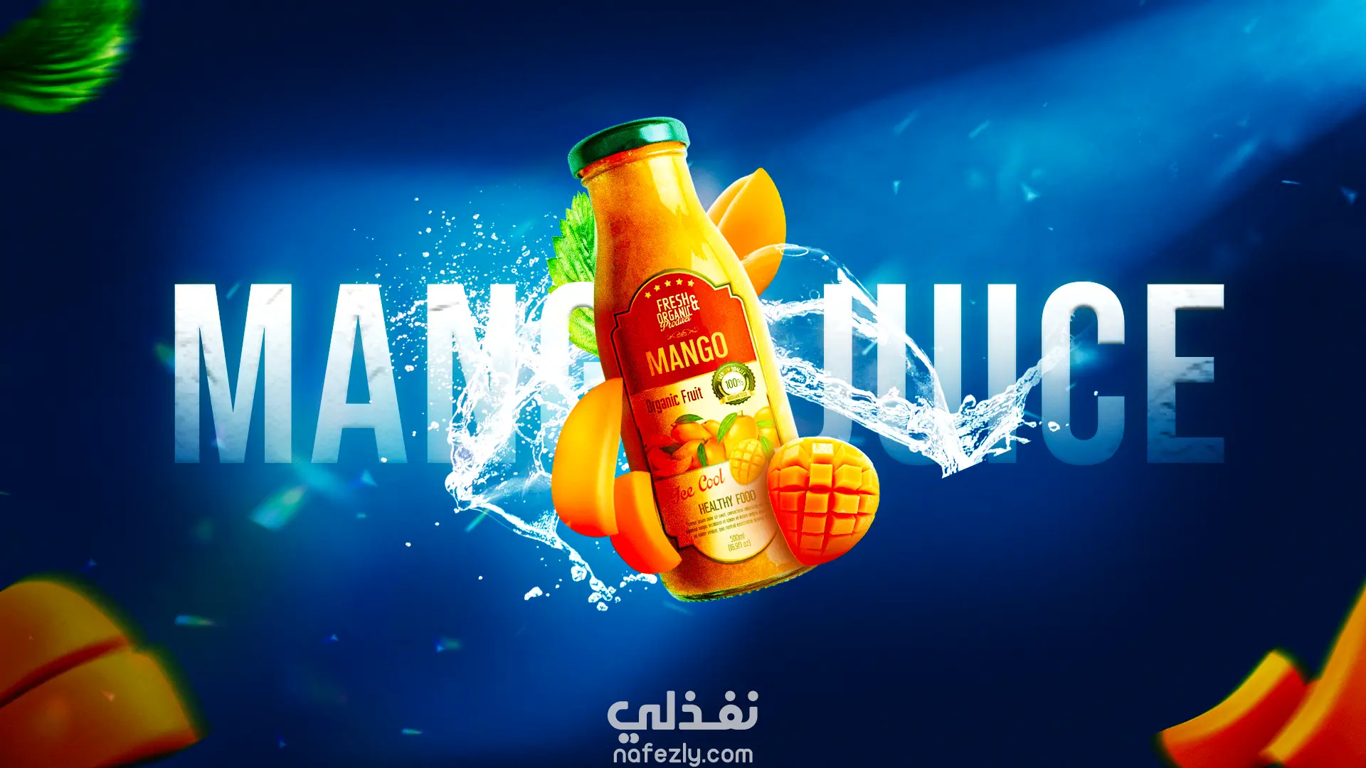 تصميم إعلاني لمنتج عصير مانجو.