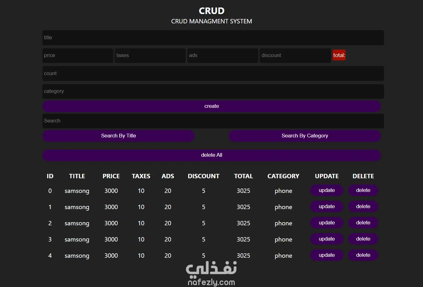 نظام إدارة منتجات (CRUD) مع حساب السعر الإجمالي تلقائياً الوصف