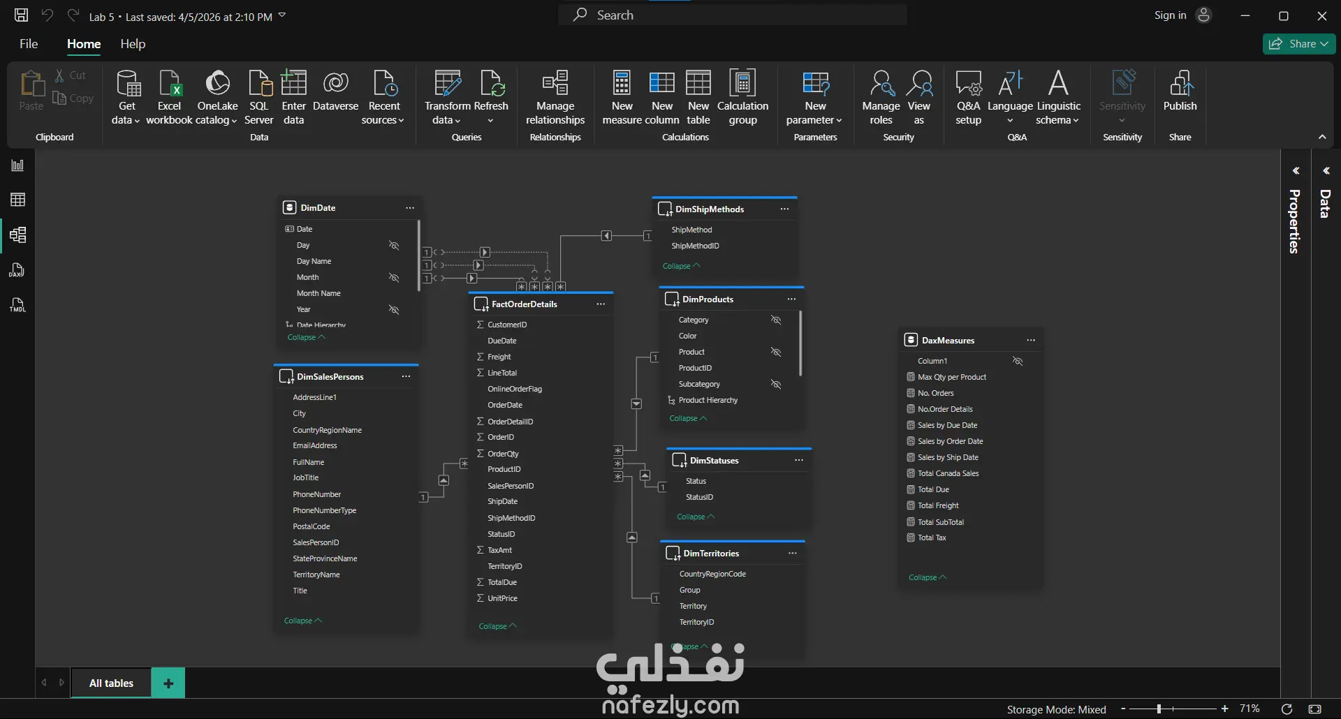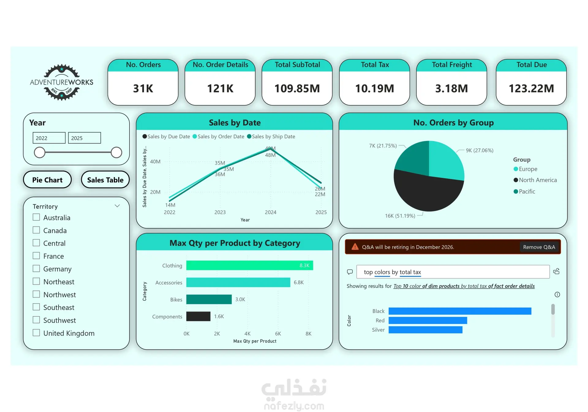 تحليل بيانات لشركه بحيث يتم معرفة التالي: 1- عدد الطلبات 2- كمية الضرائب 3- عدد المبيعات مقارنة مع الزمن 4- عدد الطلبات مقارنة مع مكان الطلب 5- أكبر عدد من الكميات المطلوبه لكل منتج مقارنة بنوع المنتج و المقدره علي معرفة ما سبق أيضا بواسطة فلاتر في سنه معينه أو بلد معينه