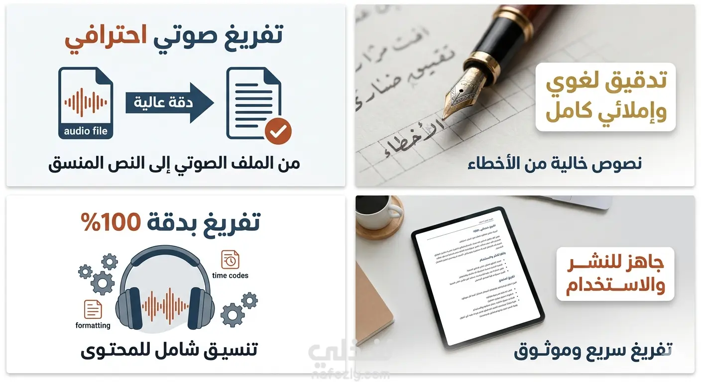 قدم خدمة تفريغ المحتوى الصوتي (بودكاست، محاضرات، لقاءات) إلى ملفات نصية منظمة. أضمن لك: التدقيق اللغوي والنحوي الكامل. صياغة الجمل بأسلوب يسهل قراءته. الالتزام بالوقت المحدد للتسليم.