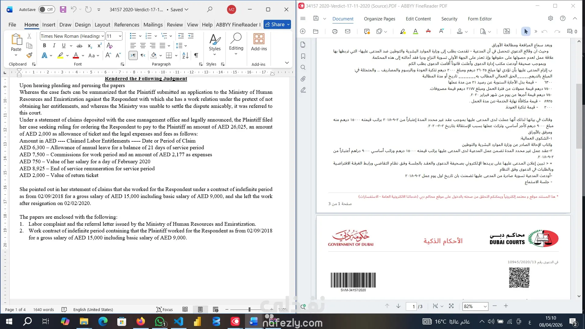 ترجمة حكم محكمة صادر عن محاكم دبي الإبتدائية بخصوص قضية عمالية مكون من 3 صفحات.