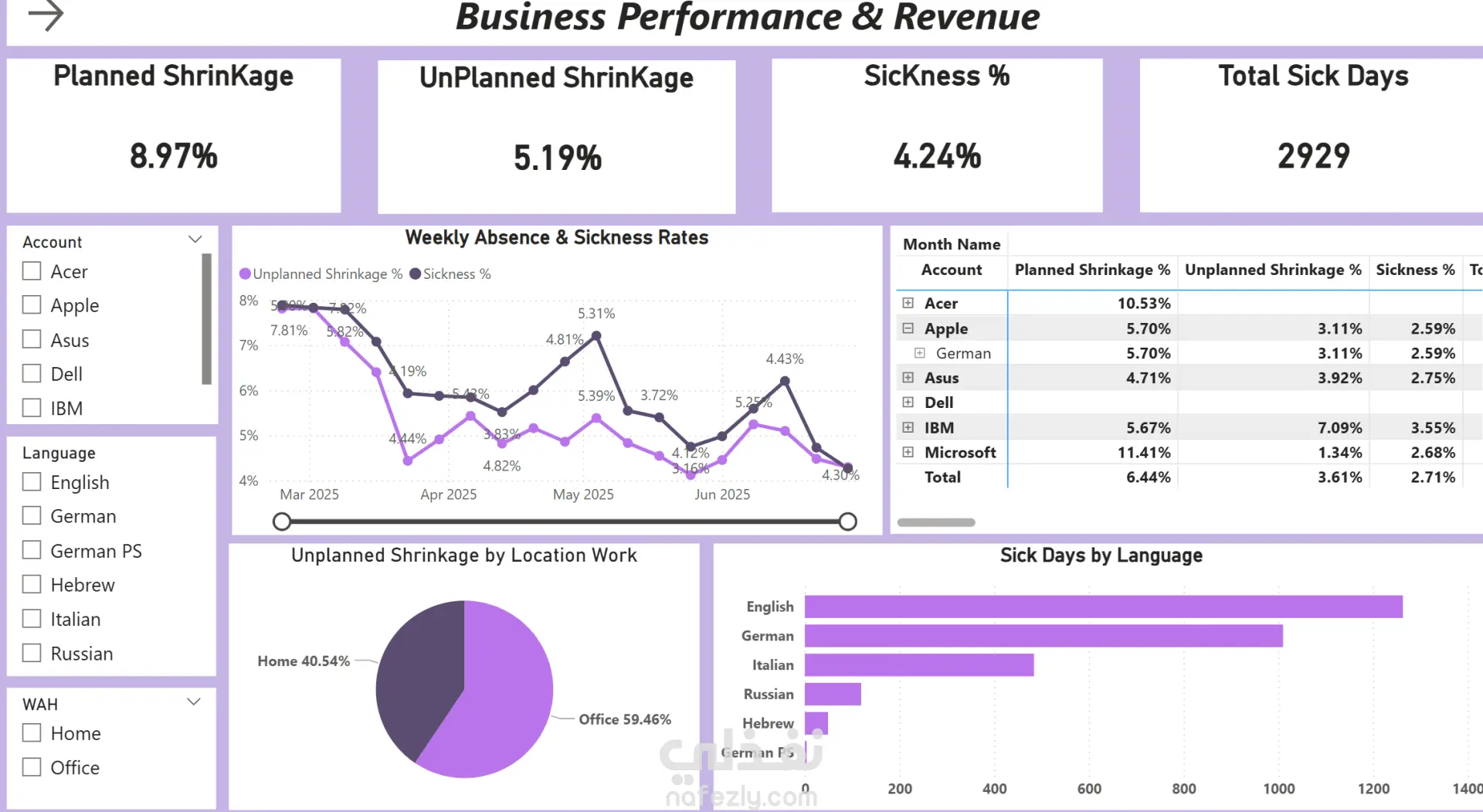 تصميم لوحة قياس متكاملة تربط بين المؤشرات التشغيليةو النتائج المالية يهدف المشروع إلى مراقبة تأثير غياب الموظفين و"الانكماش" على ساعات العمل الفعلية، ومقارنتها بالتوقعات المالية لتحقيق أقصى استفادة من الموارد البشرية.