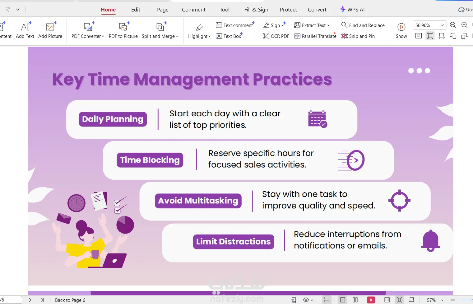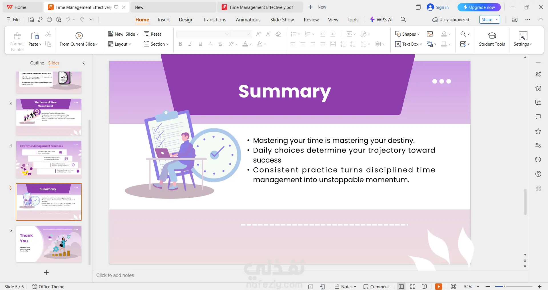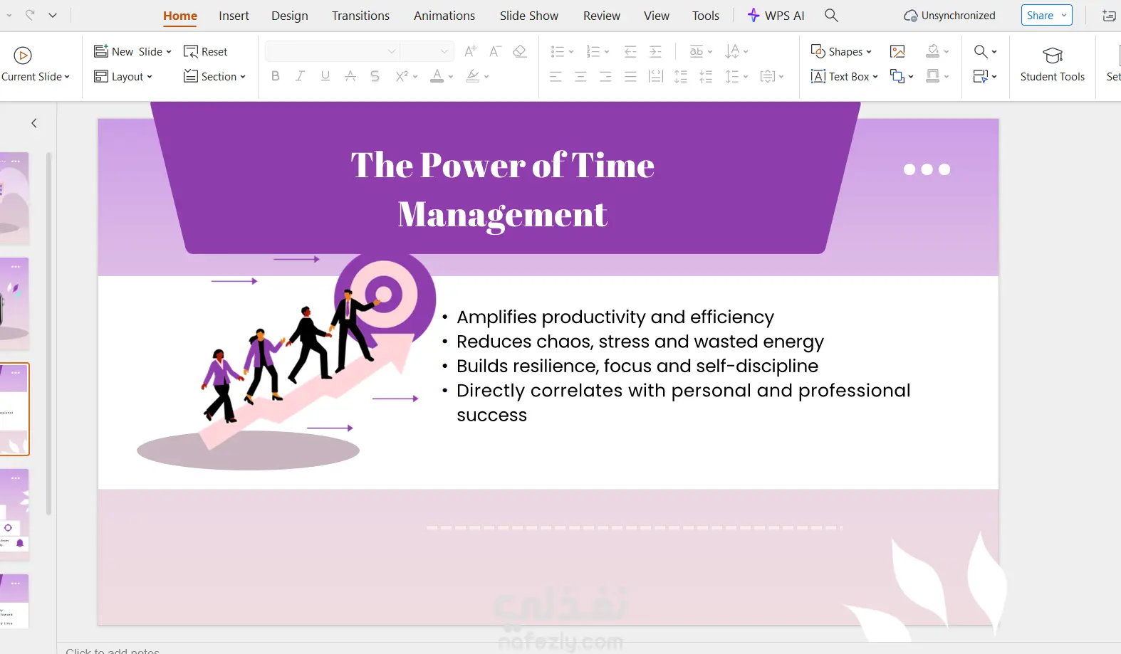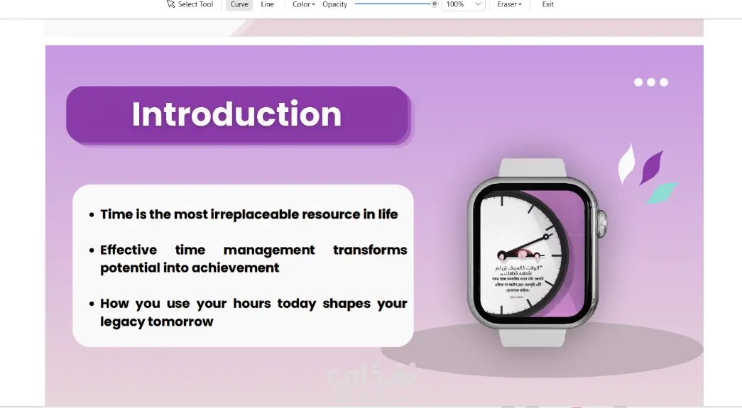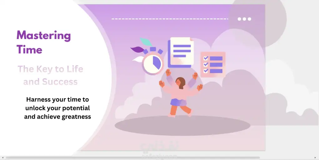 أنشأت باور بوينت يوضح أهمية الوقت و طرق تنظيم وإدارة الوقت بشكل عملي ، وتحديد خطوات لإدارة الوقت وتحديد الأولويات لتحسين الإنتاجية اليومية؛ تصميم الشرائح منظم وواضح يسهل متابعة الأفكار .