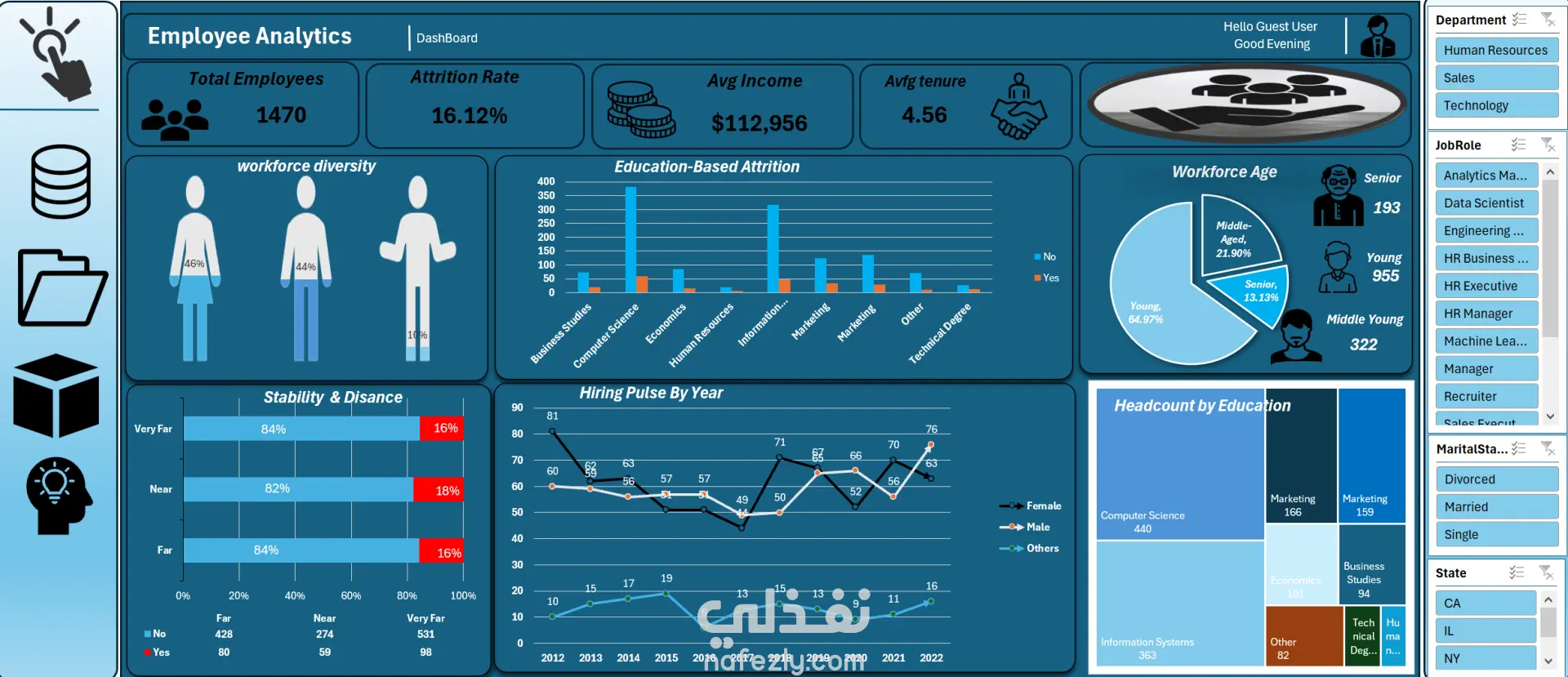 المشروع يركز على تحليل معدل دوران العمالة (Attrition Analysis) وفهم العوامل التي تؤثر على بقاء الموظفين أو استقالتهم، بالإضافة إلى مراقبة التنوع وتوزيع الرواتب والتركيبة العمرية إجمالي عدد الموظفين: 1470 موظفاً. معدل الاستقالات : بنسبة 16.12%، وهو مؤشر يحتاج لمراقبة لمعرفة أسباب ترك الموظفين للعمل. متوسط الدخل : 112,956 دولار. متوسط سنوات الخبرة/البقاء : 4.56 سنوات. تتضمن اللوحة عدة تحليلات دقيقة: تنوع القوى العاملة : يوضح نسب الجنسين داخل المنظمة. الاستقالات بناءً على التعليم : يوضح أي التخصصات التعليمية هي الأكثر عرضة لترك العمل (يظهر أن تخصص علوم الحاسوب "Computer Science" هو الأعلى عدداً). توزيع الأعمار : يظهر أن الغالبية العظمى من الموظفين هم من فئة الشباب (Young) بنسبة تقارب 65%. الاستقرار والمسافة : يدرس العلاقة بين بُعد سكن الموظف عن العمل وبين احتمالية تركه للوظيفة. نبض التوظيف السنوي : خط زمني يوضح تطور عمليات التوظيف للذكور والإناث وفئات أخرى من 2012 إلى 2022. خريطة المساحة للتعليم : توضح الأحجام النسبية لكل تخصص تعليمي داخل الشركة.