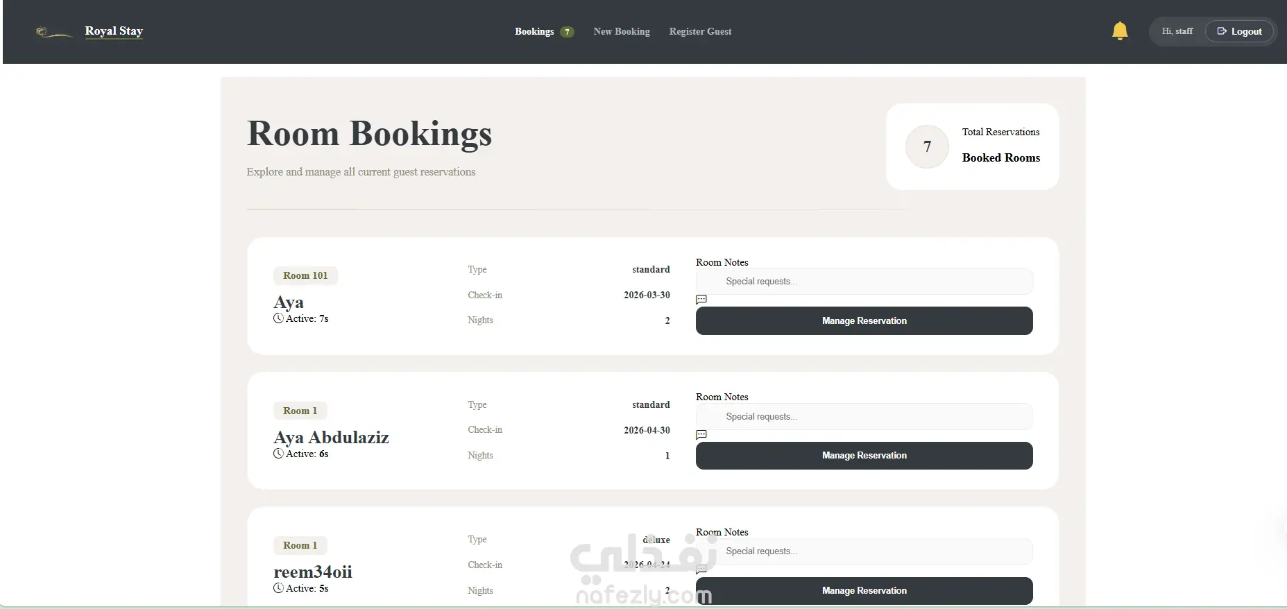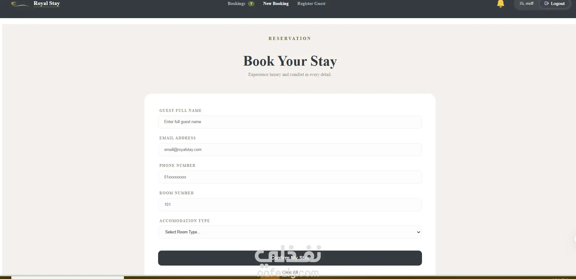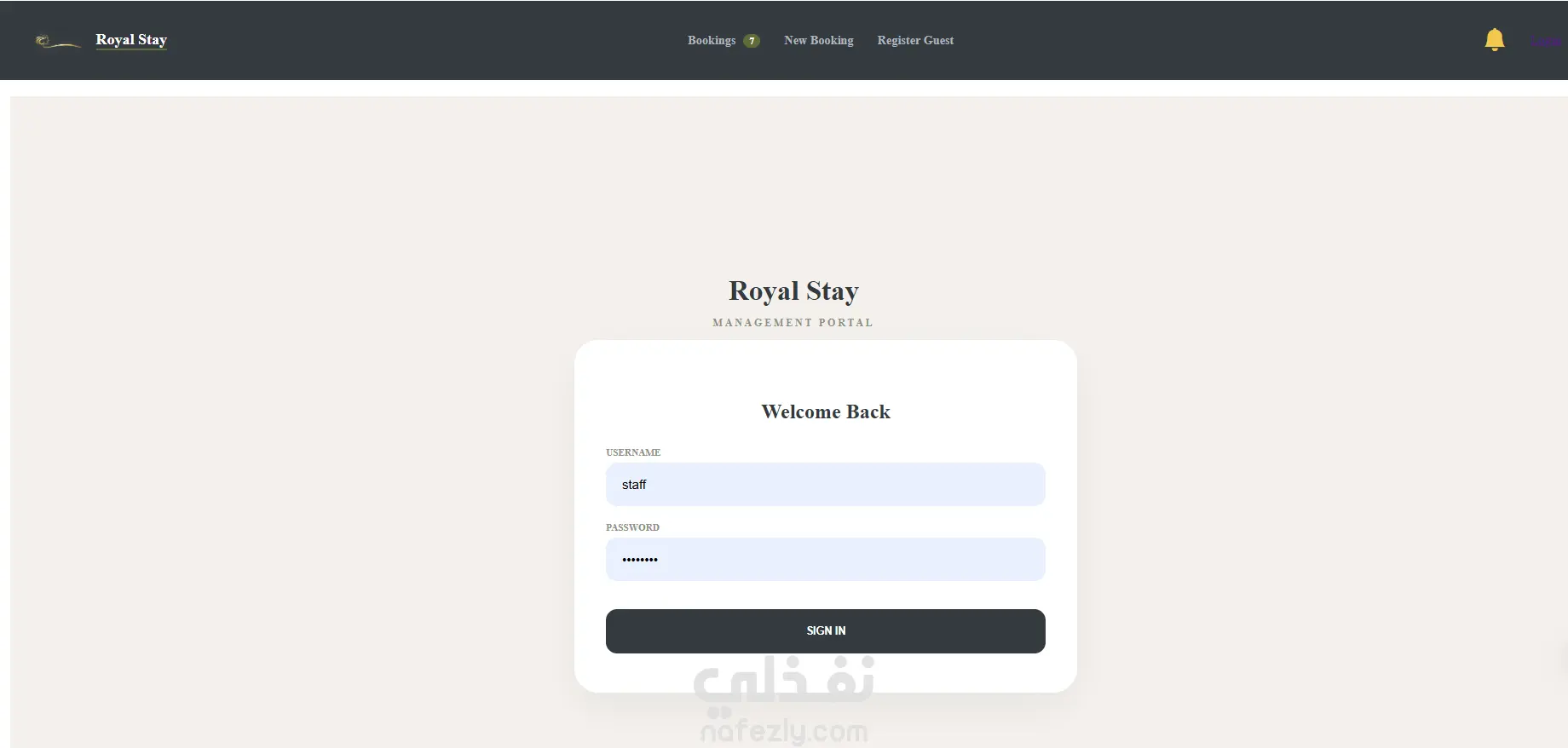 مشروع Royal Stay هو منصة إدارية متطورة مصممة لتبسيط عمليات الحجز الفندقي وإدارة بيانات النزلاء. تم التركيز في هذا المشروع على الجمع بين الأداء التقني العالي وتجربة المستخدم السلسة (UX) باستخدام هوية بصرية ملكية.