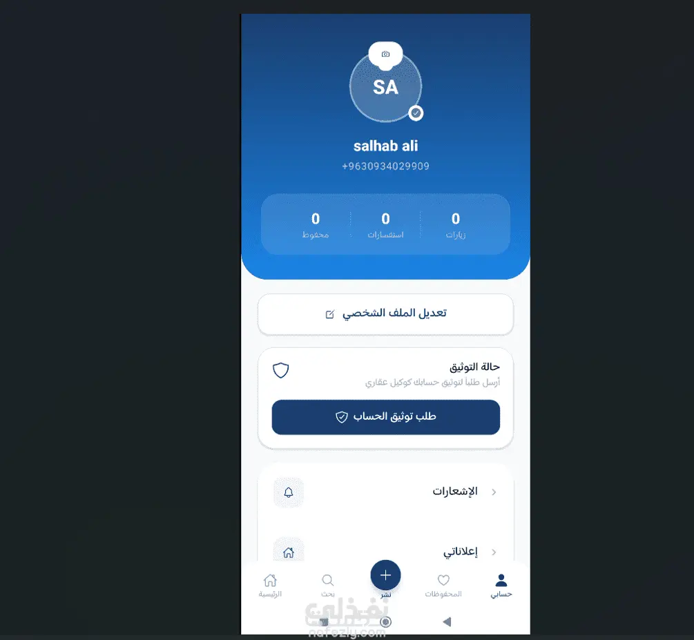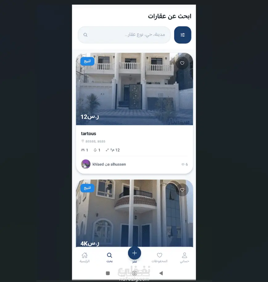 تطبيق الجوال (React Native / Expo) تسجيل دخول عبر رقم الهاتف + رمز OTP (Twilio SMS) شاشة تعريفية (Onboarding) بتصميم احترافي عرض العقارات مع صور متعددة وتفاصيل كاملة (مساحة، غرف، سعر، موقع على الخريطة) بحث متقدم مع فلاتر (نوع العقار، المدينة، السعر، المساحة) نشر إعلانات العقارات مع رفع صور متعددة حفظ العقارات المفضلة التواصل مع المالك عبر الاتصال أو واتساب مباشرةً تفعيل الوضع الليلي والفاتح دعم اللغتين العربية والإنجليزية بالكامل (RTL/LTR) نظام إشعارات push توثيق حسابات الوكلاء العقاريين تصميم متجاوب مع حركات سلسة (Moti animations) لوحة تحكم إدارية (React / Vite / Tailwind) إدارة المستخدمين، العقارات، المدن مراجعة طلبات توثيق الوكلاء (قبول / رفض) إحصائيات ولوحة تحليلية اك إند (Node.js / Express / MongoDB) API كاملة (مصادقة، عقارات، مفضلة، مدن، إشعارات، توثيق) رفع الصور والأفاتار JWT للمصادقة الآمنة تسجيل دخول بالهاتف + OTP نظام مصادقة آمن عبر رسائل SMS مع رمز تحقق مؤقت نشر وإدارة العقارات إضافة عقارات مع صور متعددة، السعر، الموقع، والتفاصيل الكاملة بحث وفلترة متقدمة تصفية حسب النوع، المدينة، السعر، والمساحة بشكل فوري دعم اللغتين عربي/إنجليزي واجهة كاملة بالعربية والإنجليزية مع دعم RTL/LTR وضع ليلي وفاتح تبديل المظهر مع دعم إعداد النظام تلقائياً توثيق الوكلاء العقاريين نظام طلب وقبول ورفض توثيق حسابات الوكلاء
