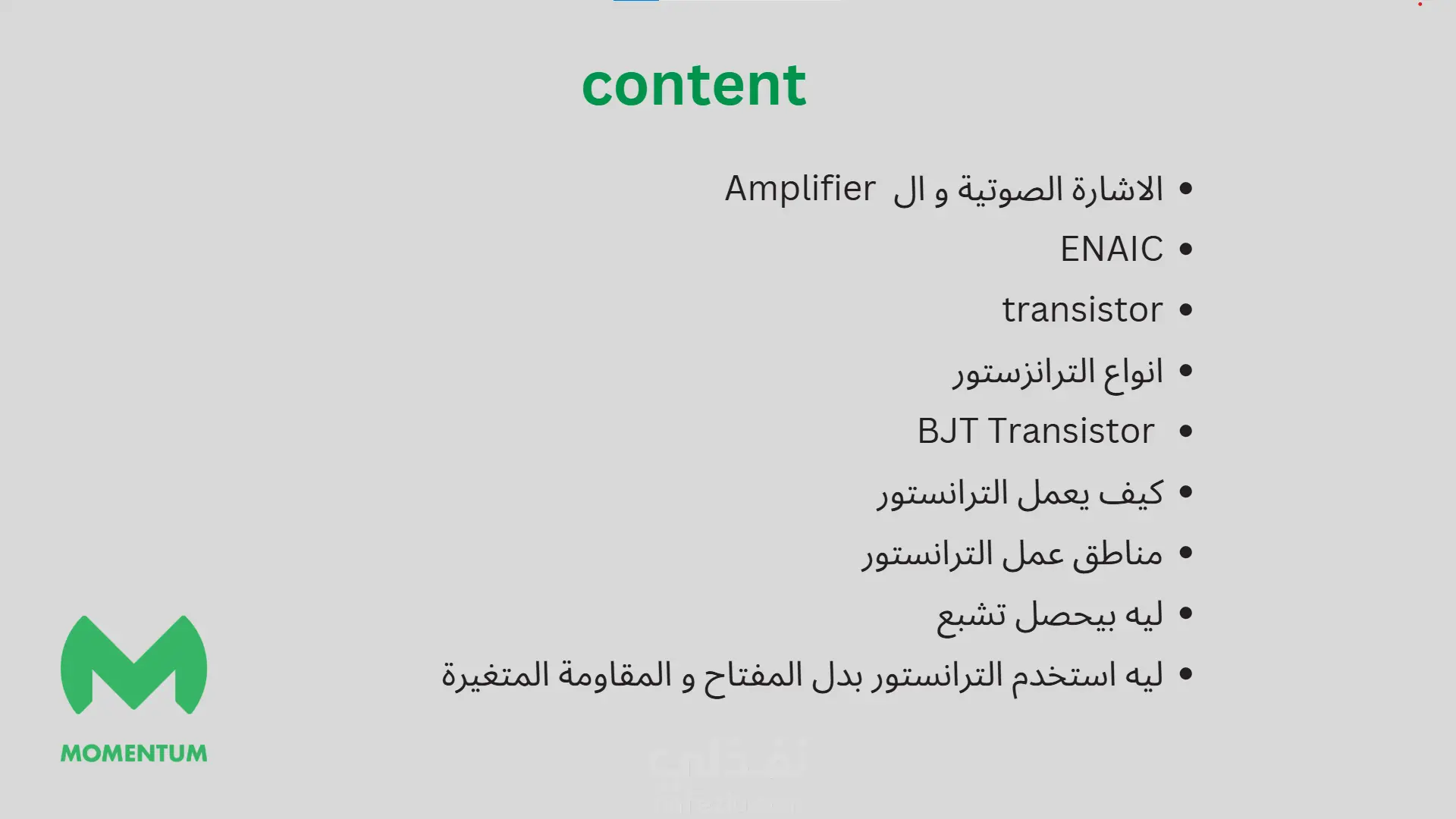 في هذا المشروع، قمت بإعداد عرض تقديمي تعليمي يشرح أساسيات الترانزستور، وهو العنصر الجوهري في الدوائر الإلكترونية، بأسلوب يجمع بين المخططات الهندسية والشرح المبسط.تغطية المفاهيم الأساسية: شرح تكوين الترانزستور من المواد نصف الناقلة (P-type و N-type).توضيح الأنواع: المقارنة بين أنواع الترانزستورات مثل (NPN) و(PNP) وكيفية تحديد أطراف كل نوع (Emitter, Base, Collector).تحليل التشغيل: شرح طرق توصيل الترانزستور في الدوائر المختلفة (Common Base, Common Emitter, Common Collector).التصميم البصري: استخدام رسوم بيانية توضح حركة الشحنات والتيارات داخل المكون لتبسيط الفهم الأكاديمي.