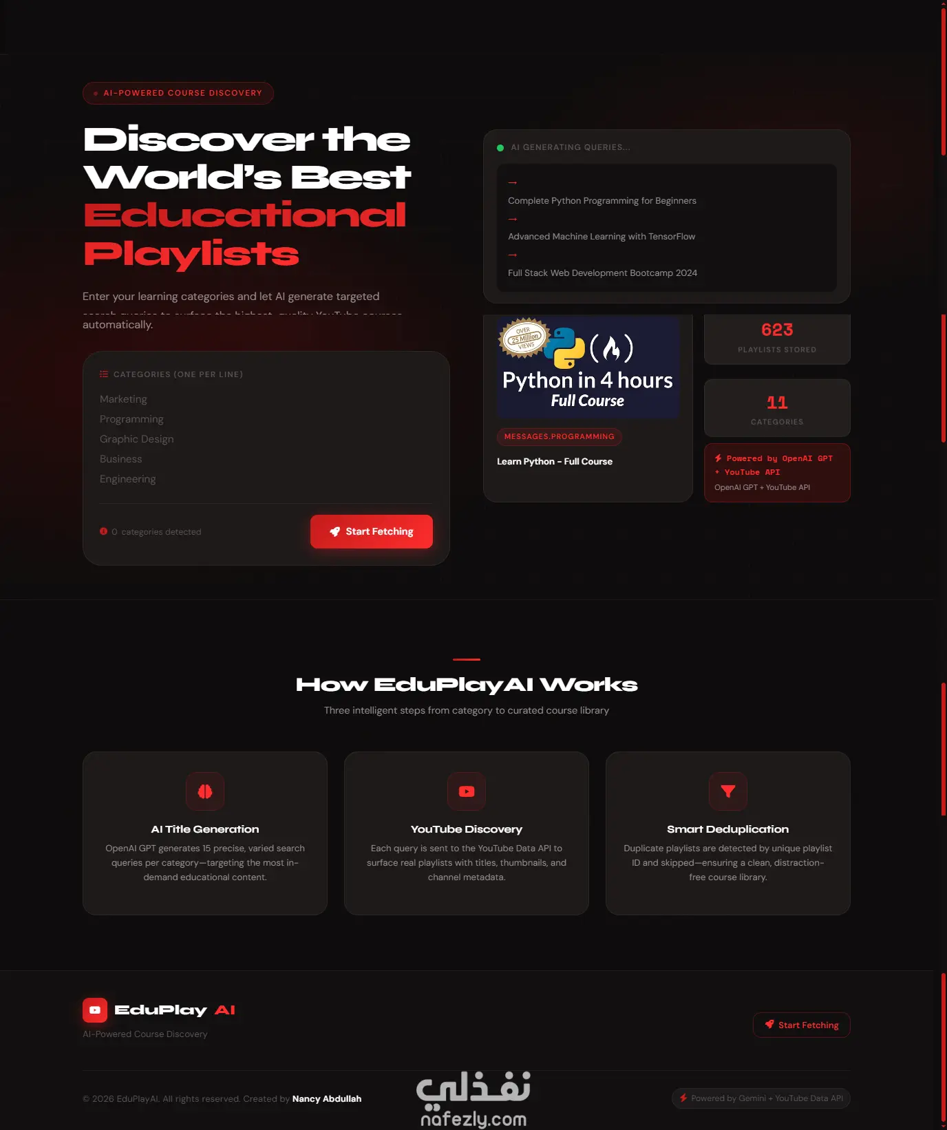 - منصة تعليمية مدعومة بالذكاء الاصطناعي تقوم بإنشاء قوائم تشغيل تعليمية من يوتيوب بشكل مُنظم بناءً على موضوع التعلم الذي يحدده المستخدم.