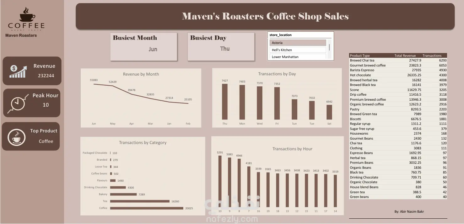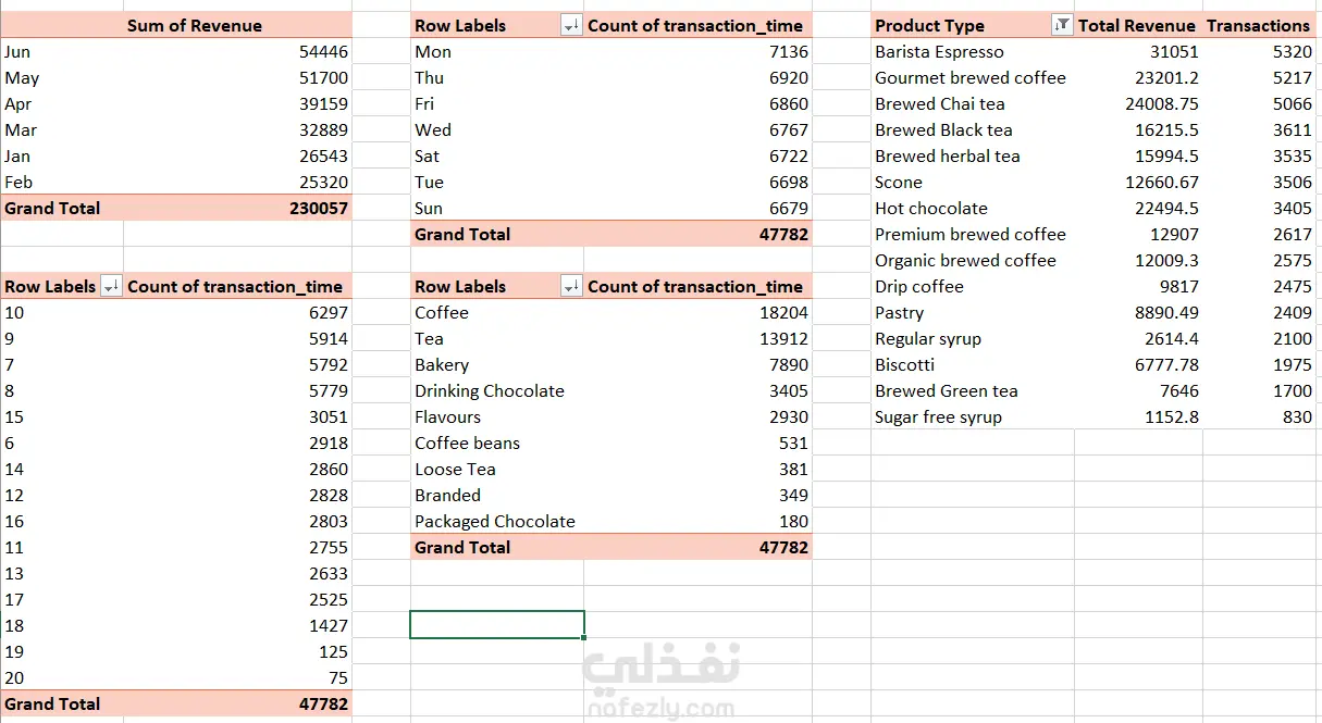تُظهر الرسوم البيانية انخفاض الإيرادات تدريجيًا من يونيو حتى فبراير، وأن أيام الأسبوع تحقق معاملات أكثر من عطلة نهاية الأسبوع، كما تتركز ذروة النشاط في ساعات الصباح. ويؤكد تحليل الفئات أن القهوة والشاي يهيمنان على المبيعات، بينما يوضح جدول المنتجات تفاصيل الإيرادات وعدد العمليات لكل منتج.