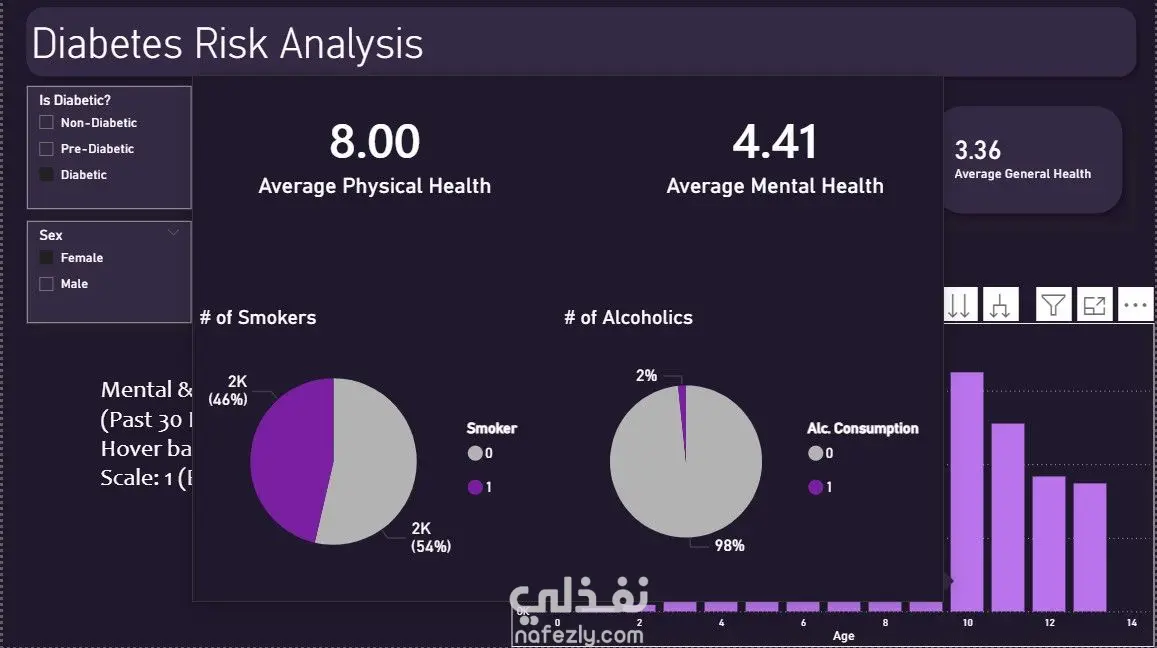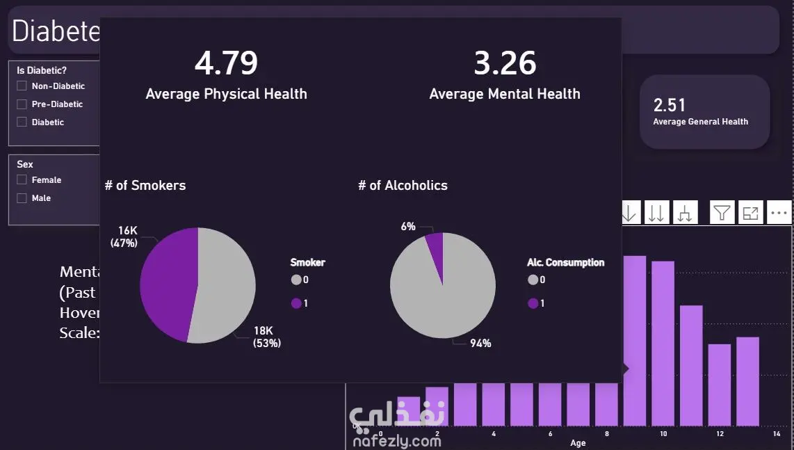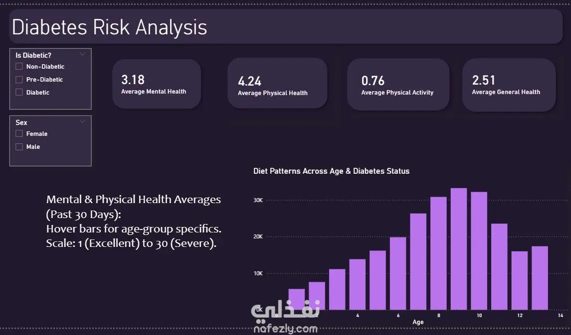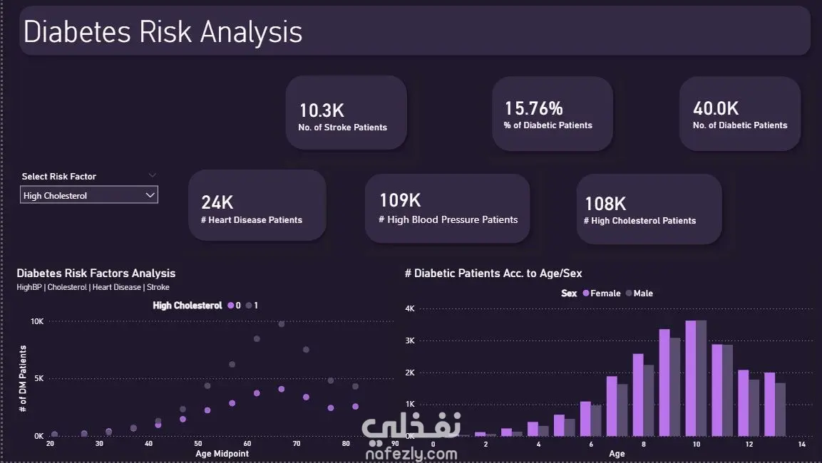 هدف هذا المشروع إلى تحليل بيانات مرضى السكري واستخراج أبرز الأنماط والمؤشرات الصحية المرتبطة بالمرض. اعتمد التحليل على مجموعة بيانات حقيقية تضم متغيرات طبية متعددة مثل مستوى الجلوكوز، ضغط الدم، مؤشر كتلة الجسم (BMI)، والعمر. تم بناء لوحة تحكم تفاعلية توضح توزيع المرضى، ونسب الإصابة، والعلاقة بين المتغيرات الطبية المختلفة، مما يُمكّن متخذي القرار من فهم العوامل الأكثر تأثيراً في الإصابة بالمرض.