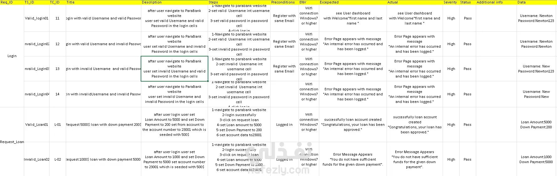 قمت بتصميم مجموعة متكاملة من حالات الاختبار (Test Cases) لنظام بنك إلكتروني (ParaBank)، بهدف ضمان جودة النظام والتأكد من عمل جميع الوظائف بشكل صحيح. تشمل حالات الاختبار: اختبار تسجيل الدخول (Login) اختبار إنشاء حساب (Registration) اختبار العمليات البنكية (Transactions) تم تصميم حالات الاختبار باستخدام أساليب احترافية مثل: الاختبار الإيجابي والسلبي (Positive & Negative Testing) اختبار الحدود (Boundary Testing) كل Test Case يحتوي على: Test Scenario Steps Expected Result Actual Result هذا العمل يعكس قدرتي على التخطيط الجيد للاختبارات وضمان تغطية شاملة للنظام.