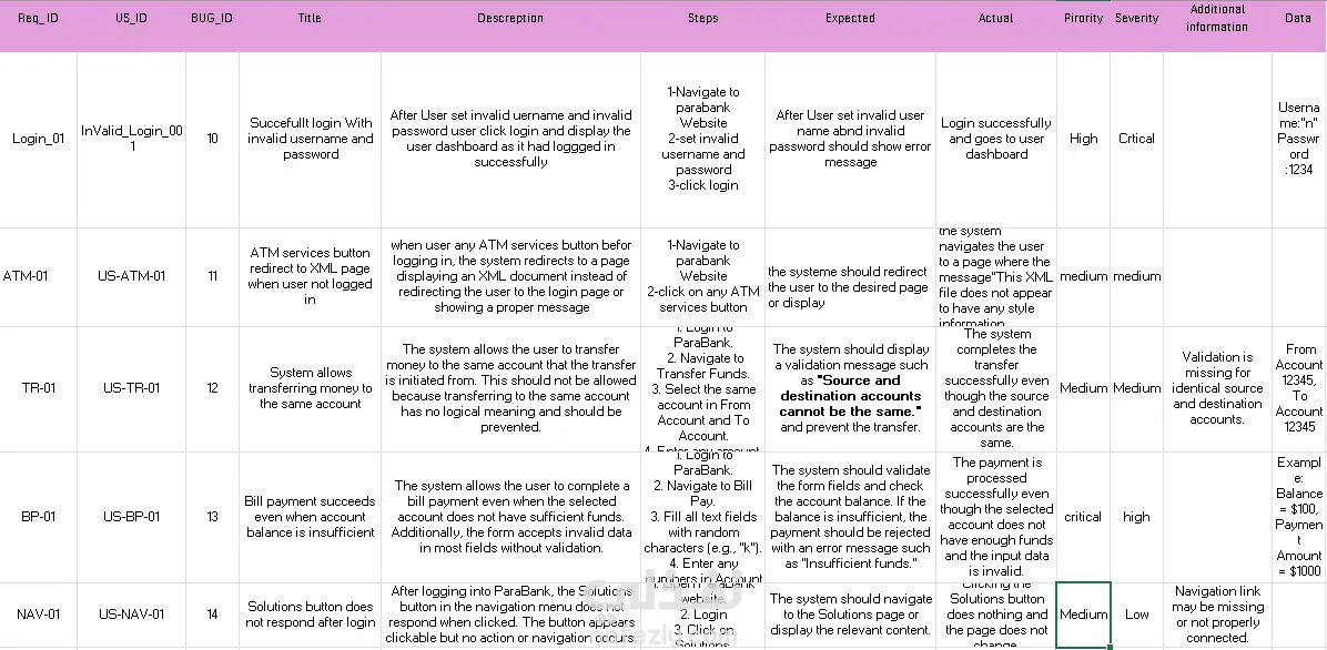 قمت بإعداد تقرير خطأ (Bug Report) احترافي لنظام بنك إلكتروني (ParaBank) وفقًا للمعايير المستخدمة في شركات البرمجيات. يتضمن التقرير: عنوان واضح للمشكلة وصف تفصيلي للخطأ خطوات إعادة المشكلة (Steps to Reproduce) النتيجة المتوقعة والفعلية تحديد مستوى الخطورة (Severity) تحديد الأولوية (Priority) بيئة الاختبار (Environment) تم تنظيم التقرير بطريقة تساعد المطورين على فهم المشكلة بسرعة والعمل على حلها بكفاءة.
