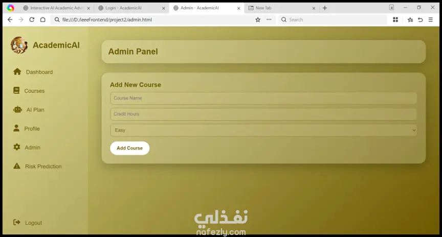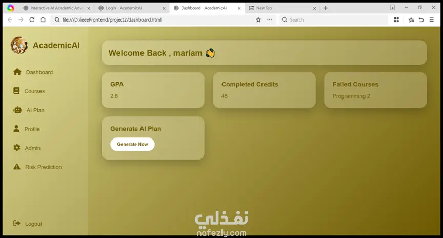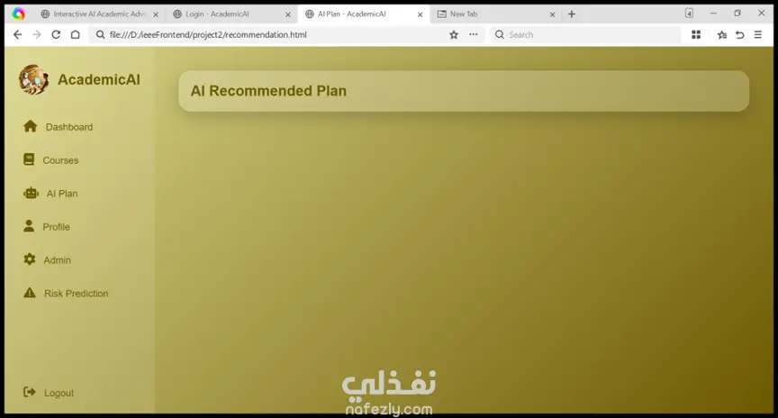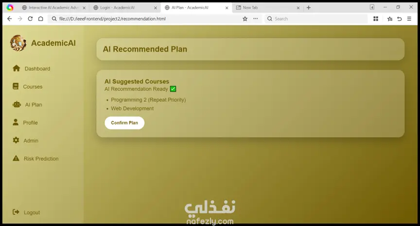 AcademicAI هو نظام إرشاد أكاديمي ذكي يساعد طلاب الجامعة على التخطيط لمسارهم الدراسي بشكل أفضل. يعتمد النظام على تحليل بيانات الطالب مثل المعدل التراكمي والمواد التي تم اجتيازها أو الرسوب فيها، ثم يقدم توصيات مناسبة للمواد التي يمكن تسجيلها في الفصل الدراسي القادم. يهدف المشروع إلى مساعدة الطلاب على اتخاذ قرارات أكاديمية أفضل وتجنب التعارضات أو الضغط الدراسي.