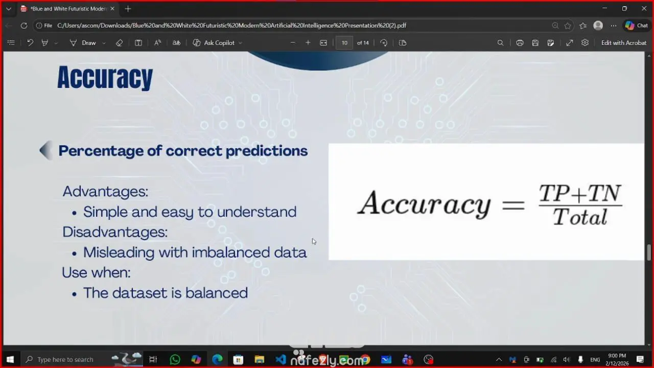 قمت بتقديم Session تعليمية كـ Instructor لشرح مفاهيم Evaluation Metrics المستخدمة في تقييم نماذج الذكاء الاصطناعي وتعلم الآلة. تناولت خلال الشرح مقاييس تقييم نماذج التصنيف (Classification) مثل: Accuracy Precision Recall F1-Score بالإضافة إلى شرح مقاييس تقييم نماذج الانحدار (Regression) مثل: Mean Absolute Error (MAE) Mean Squared Error (MSE) Root Mean Squared Error (RMSE) مع توضيح الفرق بين هذه المقاييس، ومتى يتم استخدام كل منها حسب طبيعة المشكلة. اعتمدت في الشرح على تبسيط المفاهيم باستخدام أمثلة عملية، وربط الجانب النظري بالتطبيق العملي، مما ساعد المتدربين على فهم أعمق لكيفية تقييم أداء النماذج بشكل صحيح.