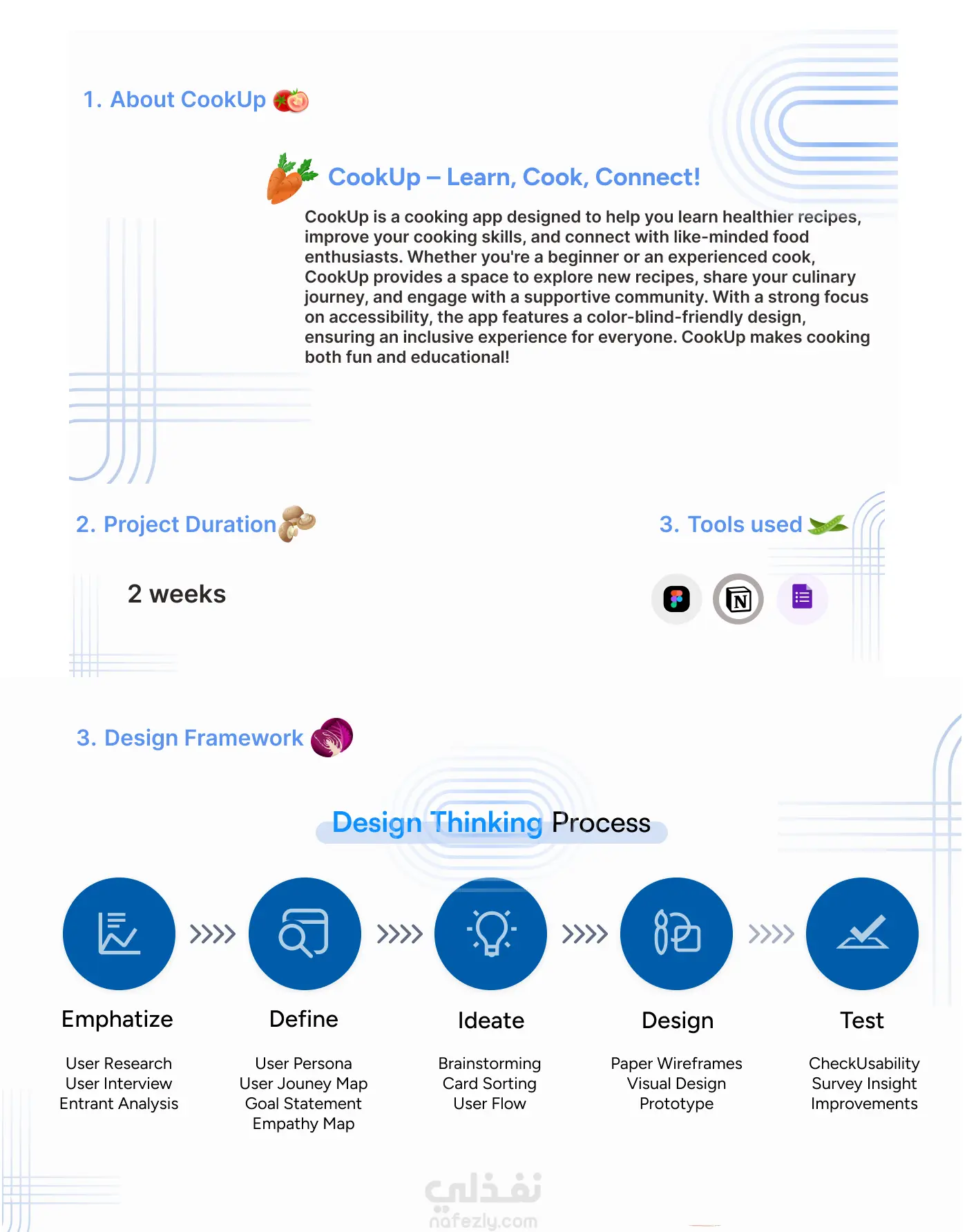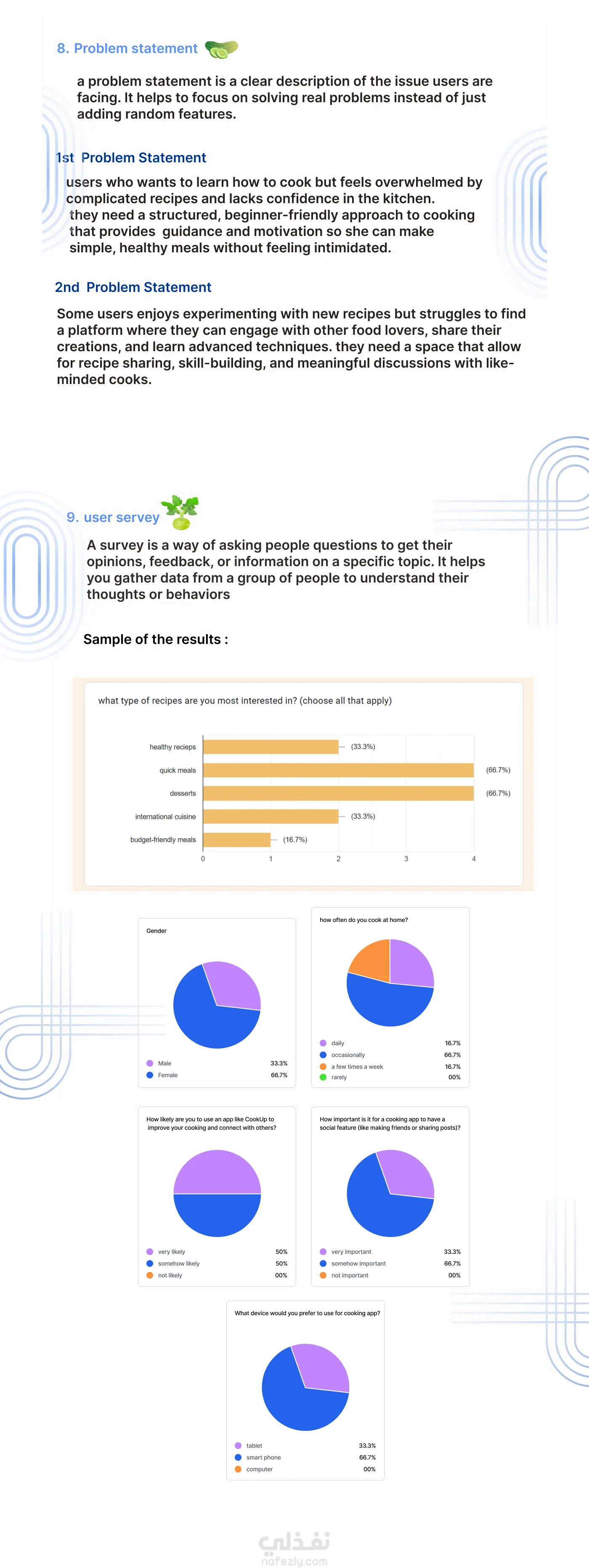 CookUp هو تطبيق للطبخ صُمم لمساعدة المستخدمين على تعلّم وصفات صحية أكثر، وتطوير مهاراتهم في الطهي، والتواصل مع أشخاص يشاركونهم نفس الاهتمام بالطعام. سواء كنت مبتدئًا أو طباخًا متمرسًا، يوفر CookUp مساحة لاستكشاف وصفات جديدة، ومشاركة رحلتك في الطهي، والتفاعل مع مجتمع داعم. يركّز التطبيق على التعلم والتفاعل الاجتماعي معًا، حيث يمكن للمستخدمين اكتشاف وصفات جديدة، ونشر أطباقهم الخاصة، والتفاعل مع الآخرين الذين يشاركونهم نفس الشغف بالطبخ. ومع التركيز القوي على سهولة الوصول، يتميز CookUp بتصميم مناسب لمرضى عمى الألوان، مما يضمن تجربة شاملة ومناسبة للجميع. يجعل CookUp الطهي تجربة ممتعة وتعليمية في الوقت نفسه.