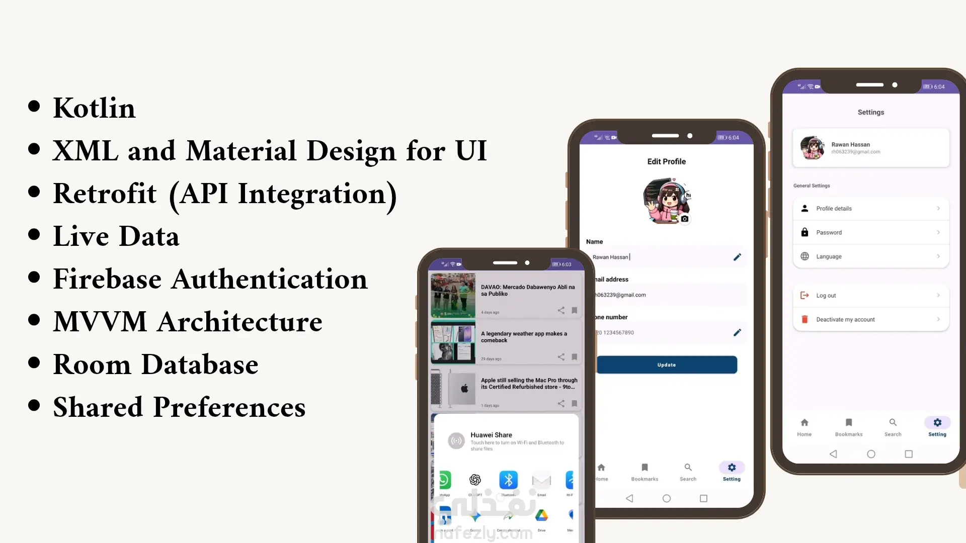كما أضفت نظام حفظ المقالات باستخدام Room لتمكين المستخدم من الوصول إليها بدون إنترنت، مع استخدام Firebase Authentication لتأمين حسابات المستخدمين.