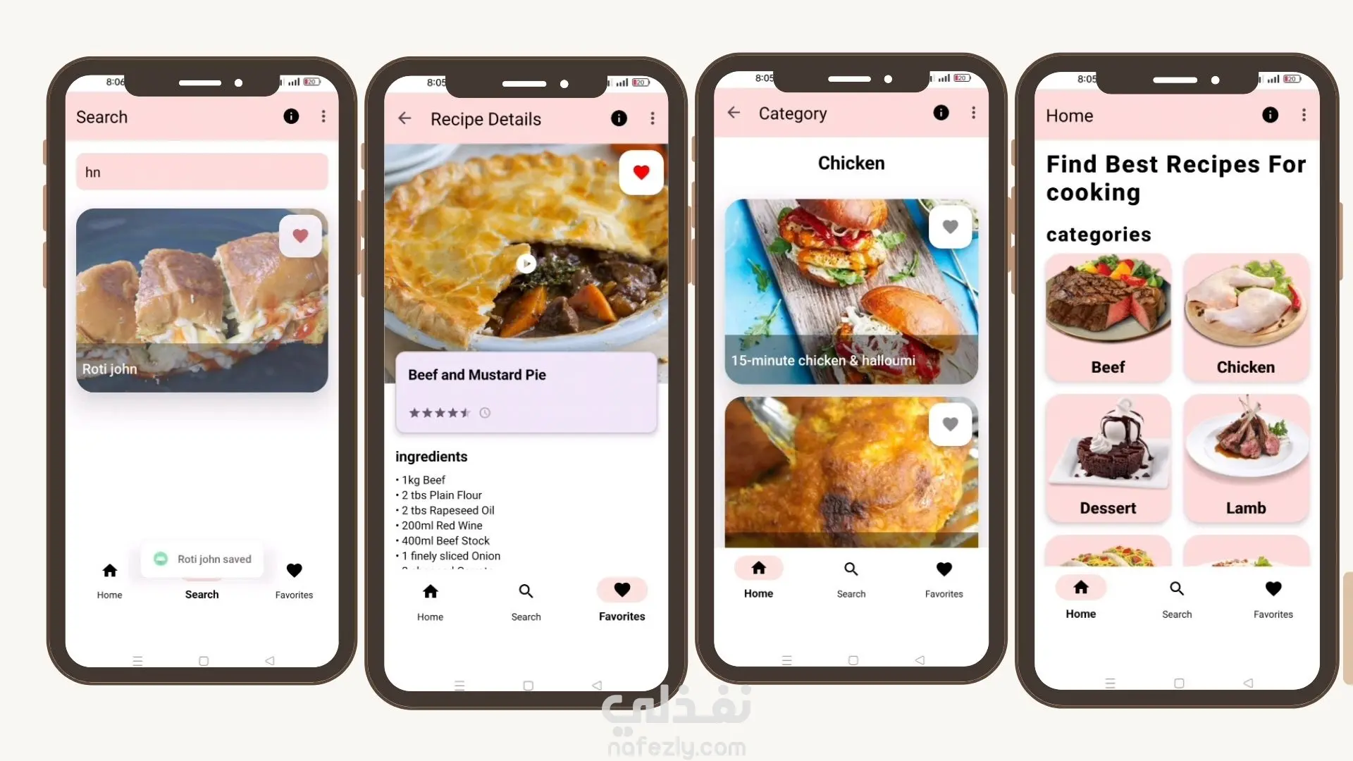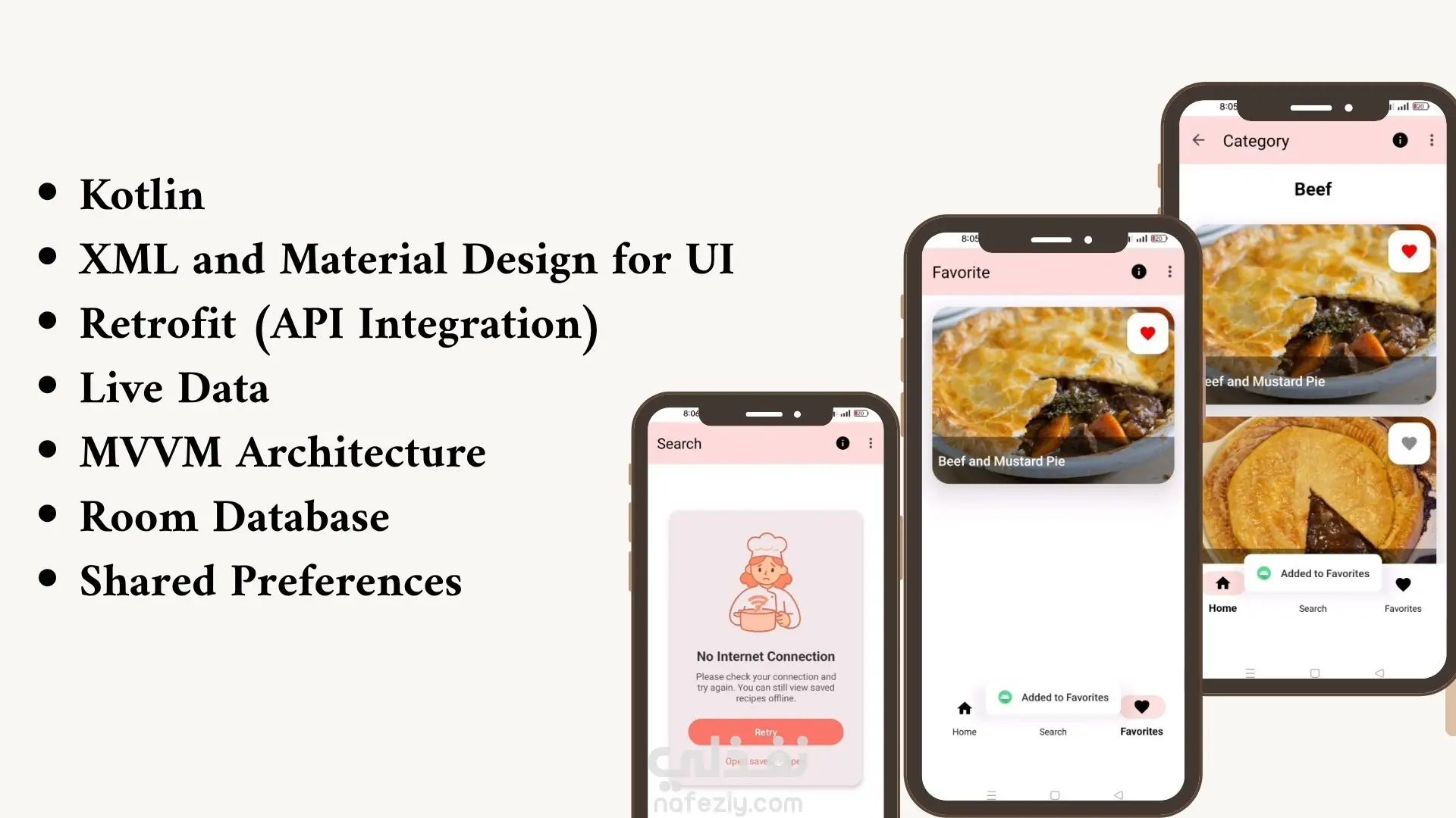 تطبيق وصفات غذائية يتيح للمستخدمين تصفح الفئات المختلفة (Categories) والوصفات داخل كل فئة، البحث عن وصفات محددة، وحفظ الوصفات المفضلة للوصول إليها لاحقًا. جميع البيانات يتم جلبها من API خارجي، مع تخزين الوصفات المفضلة محليًا باستخدام Room لتوفير تجربة سلسة وسريعة حتى بدون اتصال بالإنترنت، كما يتضمن التطبيق نظام تسجيل دخول لإدارة حسابات المستخدمين .