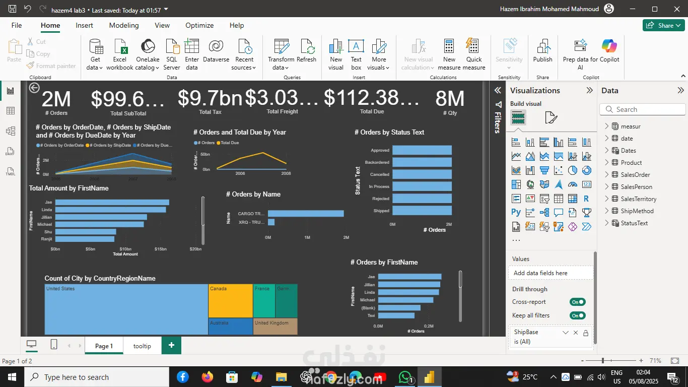 مراقبة وتحليل كفاءة معالجة الطلبات (Orders) بدءاً من الإنشاء وحتى الشحن، مع تتبع المؤشرات المالية المرتبطة بالضرائب والشحن والمدفوعات الإجمالية عبر مناطق جغرافية مختلفة.