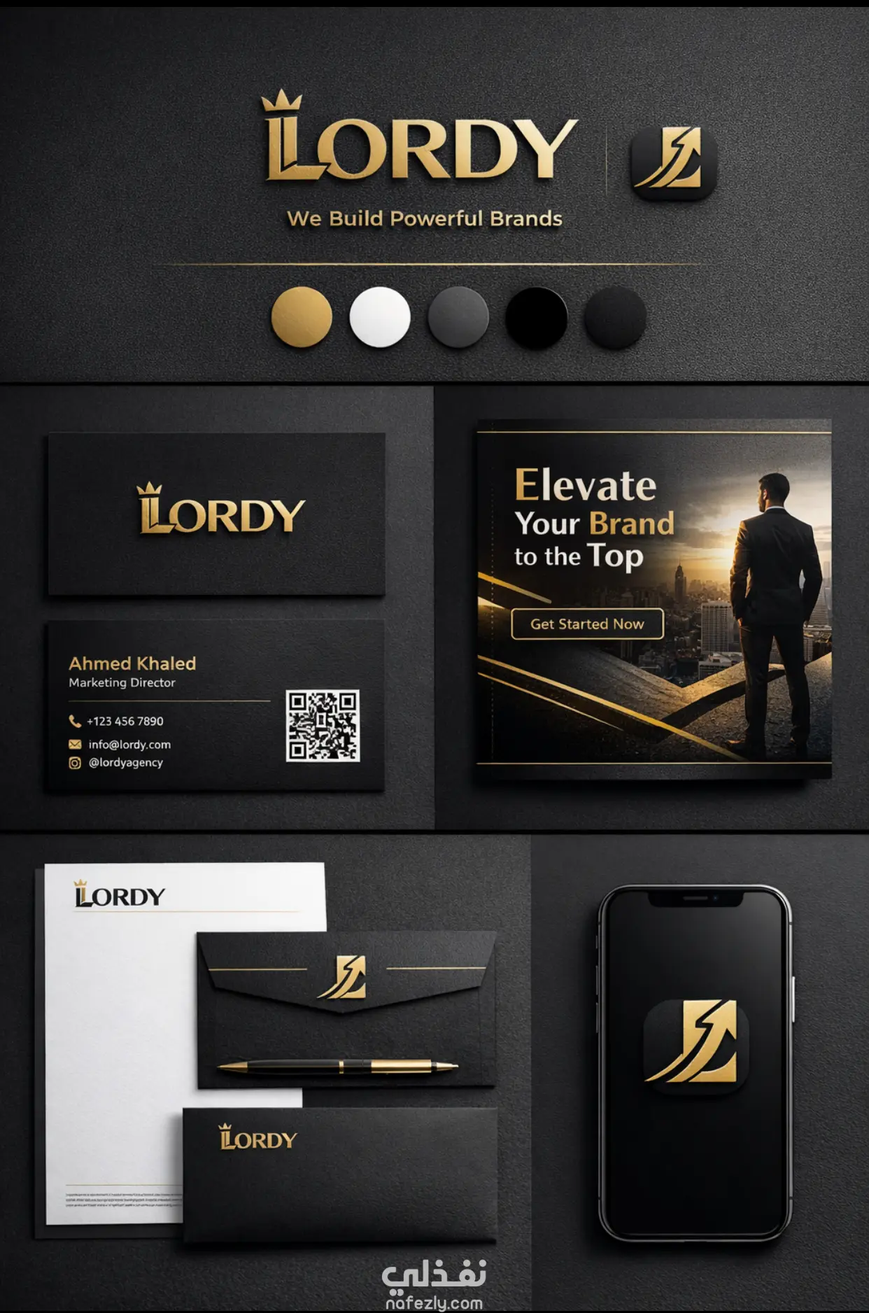 تصميم هويه بصريه لشركه دعايه وإعلان Lordy هي شركة متخصصة في الدعاية والإعلان، وقد صممت هويتها البصرية لتعكس القوة، الاحترافية، والإبداع في عالم التسويق. الهوية تعتمد على مزيج الفخامة والحداثة