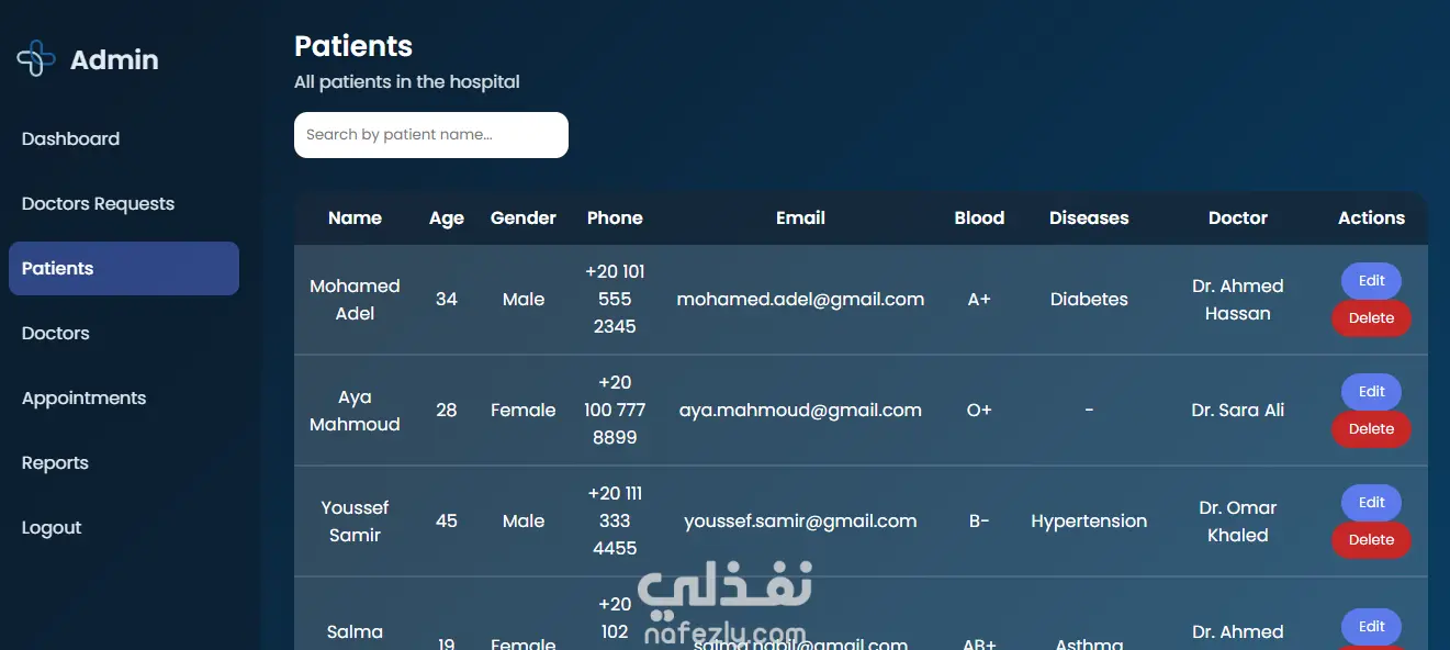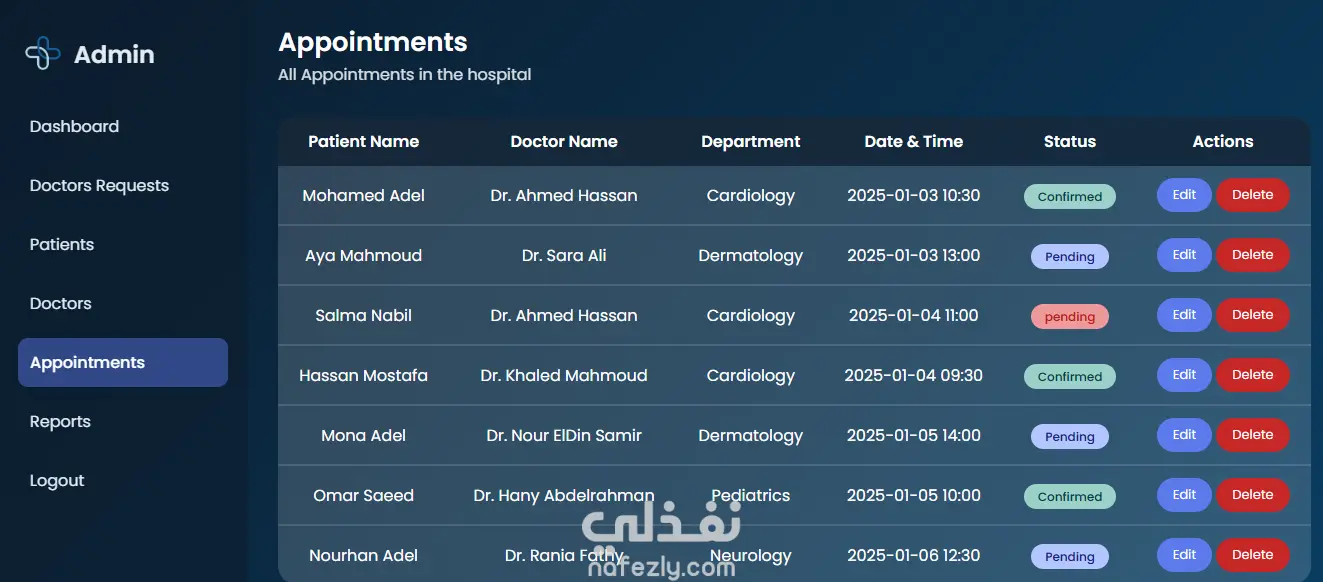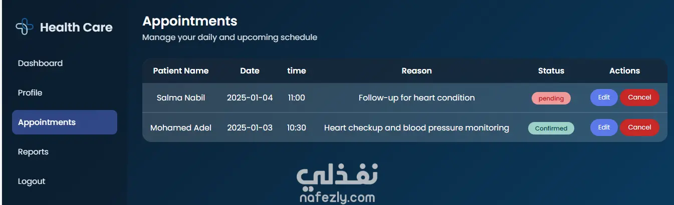HealthCare System هو تطبيق ويب متكامل لإدارة العمليات الصحية، يوفّر تجربة سهلة وآمنة لكل من المرضى والإداريين والممارسين الصحيين. 🔹 مميزات النظام: إدارة المرضى: إضافة، تعديل، حذف، وعرض بيانات المرضى إدارة المواعيد: حجز، تعديل، وإلغاء المواعيد بسهولة إدارة الأطباء: إضافة، تعديل، حذف، وجدولة مواعيدهم تقارير صحية: متابعة حالات المرضى والتقارير الطبية نظام Authentication & Authorization لتحديد صلاحيات المستخدمين لوحة تحكم Admin: إدارة المستخدمين، المواعيد، والبيانات الصحية 🔹 التقنيات المستخدمة: Backend: ASP.NET Core Web API Entity Framework Core SQL Server JWT Authentication Repository & Specification Pattern Frontend: HTML5 – CSS3 – JavaScript Bootstrap Responsive Design 🔹 الهدف من المشروع: تقديم نظام صحي متكامل يسهل إدارة المستشفيات والعيادات، مع واجهة مستخدم واضحة وأمان كامل للبيانات، وقابل للتطوير ليشمل ميزات إضافية مستقبليًا.