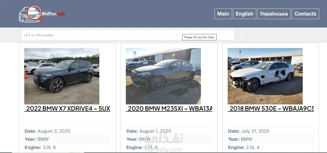 أرشيف إحصائيات السيارات الوارد الأمريكي المباعة في مزادات كوبارت و iaai حيث يتم تصنيف السيارات مع بياناتها وفق : الصانع ـ الموديل ـ السنة تضاف البيانات التقنية : المحرك ـ ناقل الحركة ـ عدد الأبواب ـ اللون ـ حالة السيارة الفنية ـ تأشيرة عداد الكيلومتر أو الميل تضاف بيانات البيع : الوثيقة ـ البائع ـ التأمين ـ مكان وتاريخ البيع ـ سعر المزاد تضاف صور السيارة الخارجية من كافة الجوانب والداخلية وصورة المحرك يستفيد من المعلومات المشتري الراغب بمعرفة تاريخ سيارته