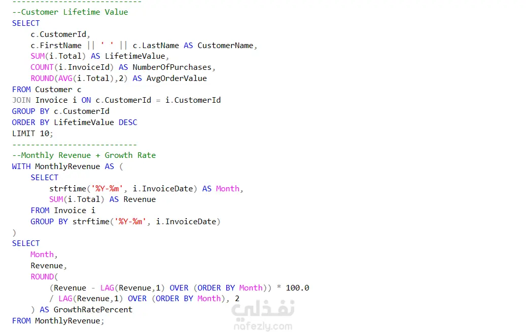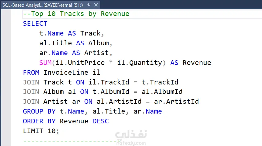 نبذة عن المشروع حللت قاعدة بيانات متجر موسيقى رقمي باستخدام استعلامات SQL متقدمة لاستخراج رؤى استراتيجية حول الإيرادات، سلوك العملاء، أداء الموظفين، والاتجاهات السوقية. التحليلات المنفذة تحليل الإيرادات والمبيعات أفضل 10 أغاني استخدمت JOIN متعددة لربط الأغاني بالألبومات والفنانين، وحسبت الإيرادات الإجمالية. أفضل 5 فنانين لكل دولة استخدمت CTE مع Window Function (RANK) للترتيب داخل كل سوق جغرافي. الإيرادات الشهرية ومعدل النمو استخدمت strftime للتجميع الشهري و LAG() لحساب النمو مقارنة بالشهر السابق. توزيع المبيعات حسب نوع الوسائط جمعت المبيعات والإيرادات حسب النوع (MP3, AAC) لتحديد القنوات الأكثر ربحية. تحليل سلوك العملاء القيمة الدائمة للعميل حسبت إجمالي المشتريات وعددها ومتوسط قيمة الطلب لأفضل 10 عملاء. أفضل 3 عملاء لكل دولة استخدمت PARTITION BY مع RANK() لتحديد العملاء الأساسيين في كل منطقة. تحليل توقف العملاء حددت العملاء غير النشطين منذ 2012 باستخدام LEFT JOIN. التحليل الجغرافي النوع الموسيقي الأكثر شعبية لكل دولة استخدمت CTE مع Window Function لتحديد النوع الأول في كل سوق. تحليل أداء المنتجات والموظفين متوسط إيرادات الألبومات استخدمت Window Function لمقارنة أداء كل ألبوم بمتوسط الفنان. عملاء الموظفين وإيراداتهم ربطت كل موظف بعملائه وحسبت الإيرادات لترتيب الأداء. التقنيات المستخدمة Common Table Expressions (CTEs) لتنظيم الاستعلامات المعقدة Window Functions RANK(), LAG(), AVG() OVER PARTITION BY Multiple JOINs ربط حتى 5 جداول (INNER & LEFT JOIN) Date Functions strftime(), DATE() Aggregate Functions SUM(), COUNT(), AVG(), GROUP BY الرؤى المستخلصة تحديد الأغاني والفنانين الأكثر ربحية فهم تفضيلات كل سوق جغرافي رصد اتجاهات النمو الشهرية تحديد العملاء الأعلى قيمة اكتشاف العملاء المعرضين للتوقف تقييم أداء الموظفين المهارات المستخدمة استعلامات SQL المتقدمة Window Functions & Analytical Functions Common Table Expressions (CTEs) Multiple Table Joins Aggregate Functions Date and Time Functions Subqueries Data Analysis & Business Intelligence الأدوات المستخدمة Microsoft SQL Server - SQL - Database Management - Data Analysis