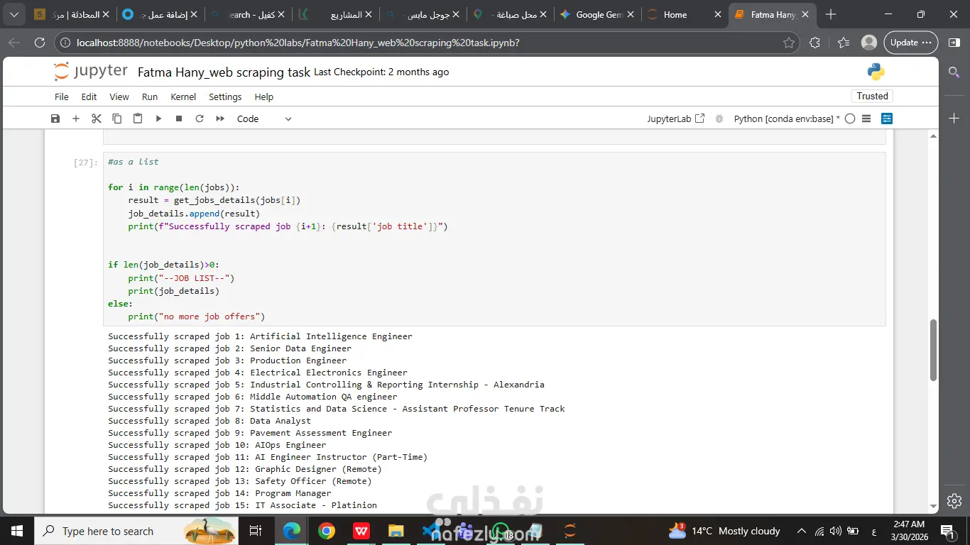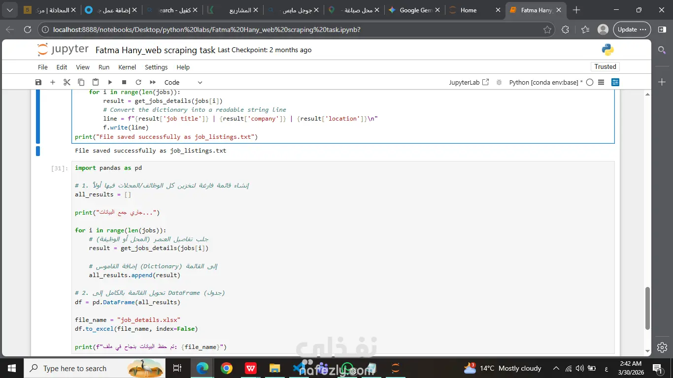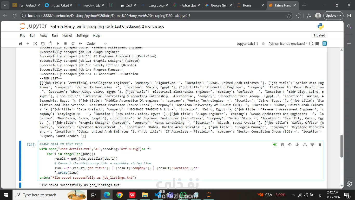 قمت بتطوير سكربت متقدم باستخدام لغة Python مخصص لاستخراج بيانات الوظائف من موقع "Wuzzuf". المشروع يهدف إلى أتمتة عملية جمع البيانات المشتتة وتحويلها إلى ملفات منظمة سهلة القراءة والتحليل (Excel & Text)، مما يساعد الباحثين عن عمل أو محللي البيانات في تتبع سوق العمل بكفاءة. المميزات التقنية للمشروع: استخراج بيانات دقيقة: سحب (Job Title, Company Name, Location) لكل وظيفة بدقة عالية. التعامل مع الصفحات (Pagination): إمكانية تحديد رقم الصفحة المطلوبة لبدء عملية المسح منها. تنظيف البيانات (Data Cleaning): استخدام دوال Python لمعالجة النصوص والتخلص من المسافات الزائدة لضمان جودة البيانات. تعدد صيغ الحفظ: تصدير البيانات إلى ملف Excel باستخدام مكتبة Pandas لتسهيل التحليل الإحصائي. حفظ البيانات في ملف Text بتنسيق مخصص ومنظم. كود نظيف ومنظم: تم بناء المشروع باستخدام وظائف (Functions) قابلة لإعادة الاستخدام لضمان سهولة التعديل أو التطوير مستقبلاً. الأدوات والتقنيات المستخدمة: Python: اللغة الأساسية للمشروع. BeautifulSoup: لتحليل ملفات HTML واستخراج المعلومات. Requests: لإرسال الطلبات للموقع وجلب محتوى الصفحات. Pandas: لتحويل البيانات إلى جداول (DataFrames) وتصديرها لملفات Excel. Jupyter Notebook: البيئة التي تم فيها كتابة واختبار الكود.