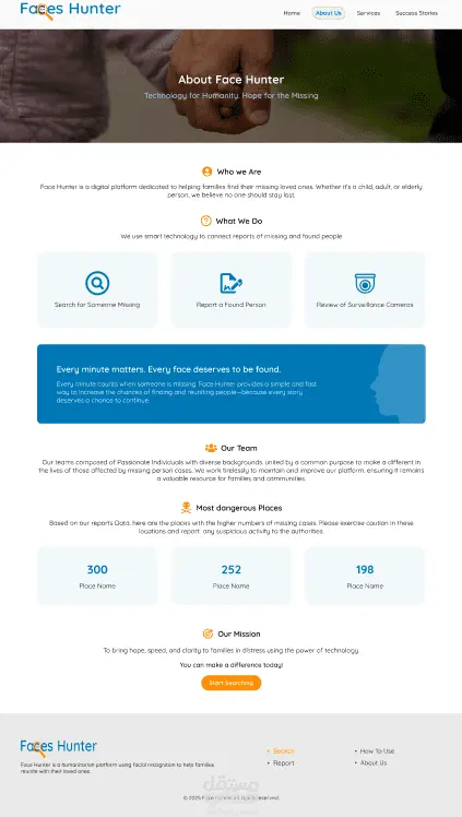 هذا تطبيق ويب مبتكر يساعد المستخدمين والجهات المختصة في البحث عن الأطفال المفقودين بسرعة ودقة، من خلال استخدام تقنيات الذكاء الاصطناعي لتحليل الصور ومطابقة الوجوه. يوفر الموقع منصة متكاملة تجمع المعلومات والصور في مكان واحد بطريقة منظمة وسهلة الاستخدام. أهم مميزات التطبيق: - البحث عن الأطفال المفقودين باستخدام الذكاء الاصطناعي لمطابقة الوجوه. - رفع الصور ومقارنتها مع قاعدة بيانات مركزية بطريقة دقيقة وسريعة. - عرض النتائج بشكل واضح ومنظم لتسهيل التعرف على الأطفال المفقودين. - أدوات تواصل مباشرة مع الجهات المختصة للإبلاغ عن الأطفال المفقودين. - تصميم متجاوب وسهل الاستخدام لجميع الأجهزة. يعكس المشروع قدرتي على تطوير مواقع عملية تركز على تقديم حلول إنسانية هامة، مع توفير أدوات تكنولوجية تساعد في إنقاذ الأطفال المفقودين بسرعة وفعالية.